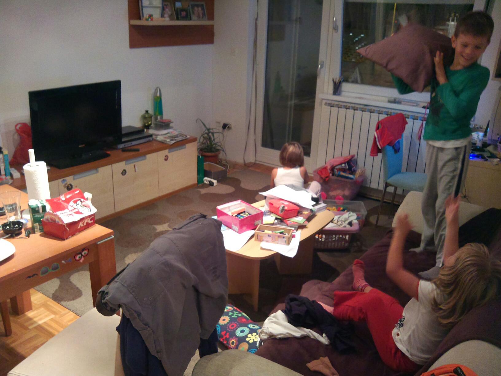 tata maznjava KFC piletinu, Veronika slaze kockice, Toni i Luana se mlate (umjereno