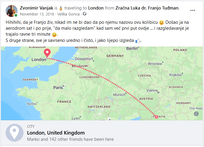Prvi put na Franji Tuđmanu … aerodromu, naravno 🤣 Podjeli ovo: Klikom podijelite na Facebooku(Otvara se u novom prozoru) Facebook Click to share on X(Otvara se u novom prozoru) X Lajk Učitavanje... Srodno PutovanjaZagreb