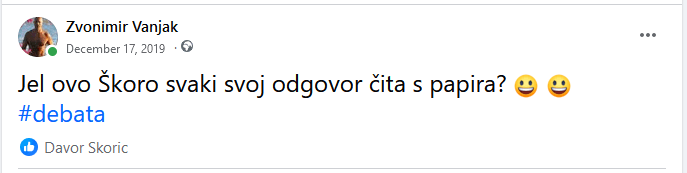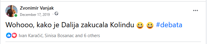 Facebook izvješće s predsjedničke debate 🤣 Podjeli ovo: Klikom podijelite na Facebooku(Otvara se u novom prozoru) Facebook Click to share on X(Otvara se u novom prozoru) X Lajk Učitavanje... Srodno Izbori