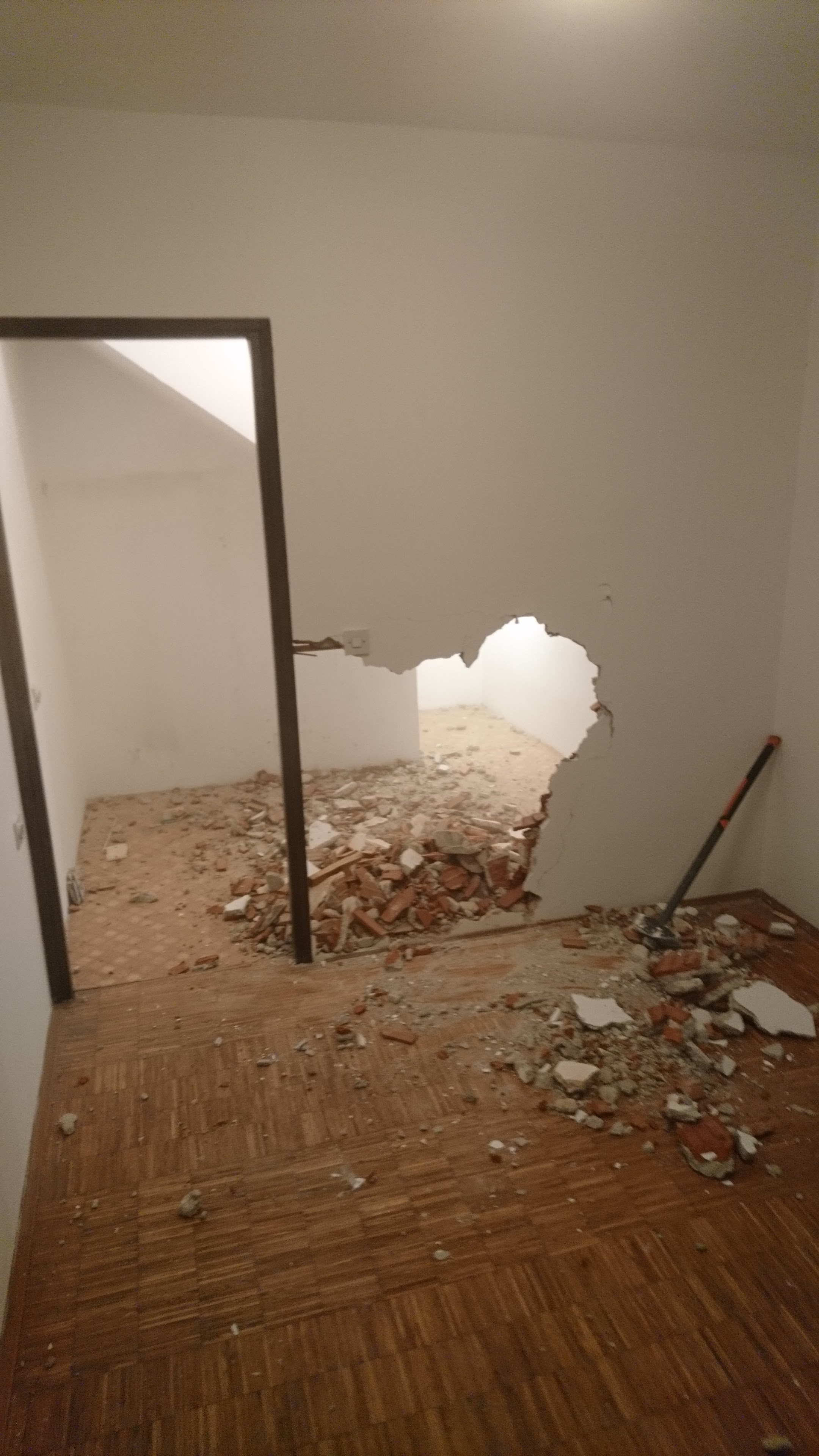 Kaže on: “Rušenje pregradnog zida iljadu kuna”. A ja imam DVA!!! Pravac Bauhaus, kupio macu za 300 kuna, počeo u 6 završio u 10 … i napravio lipu hrpicu materijala 😎