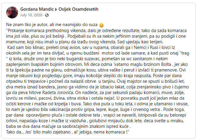 Kako se nekad rješavalo komarce 🤣 Podjeli ovo: Klikom podijelite na Facebooku(Otvara se u novom prozoru) Facebook Click to share on X(Otvara se u novom prozoru) X Lajk Učitavanje... Srodno Facebook postsFore & vicevi