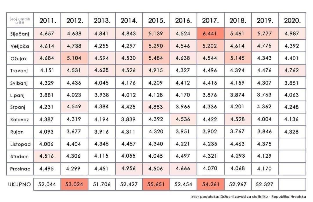 Evo službenih podataka o broju umrlih u RH, za svaki mjesec od 2011. naovamo. Gripe 2015. i 2017. su bile gadne … sad treba vidjeti hoćemo li u studenom/prosincu 2020. do novih rekorda ![]()