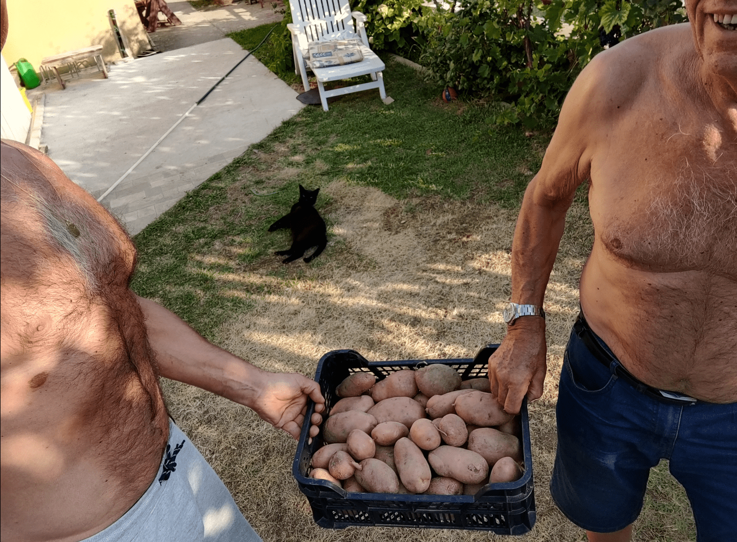 Također, ova primopredaja je više simbolične naravi jer ćaća ima punu konobu svojih krumpira 😂, i to još slađih i boljih nego moji – ja sam u vrijeme sadnje uspio nabaviti samo Kolumbe i ove crvene Desiree, ali, ćaća mi je obeća’ iduće godine nabaviti sjemenskog krumpira vrste Jerla, pa će “playing field” biti izjednačen, jer Jerla je kraljica.