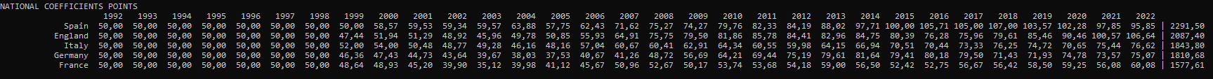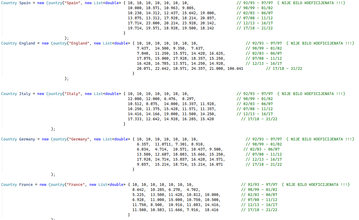 Kao što se iz slike vidi, problem sam riješio maksimalno jednostavno – tako da sam svakom savezu za tih nedefiniranih 7 godina (a u stvari 7 + 5!) stavio isti koeficijent 10.0, što je u konačnici rezultiralo sljedećom tablicom koeficijenata za svaki savez, za svaku godinu od 1992/93 naovamo: