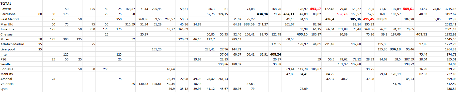 Recimo, Barcelona je zadnjih par godina sinonim za “klub u problemima”, ali brojke ne lažu, po ovoj metodologiji, od 2009. pa sve do prošle godine, Barcelona je bila najuspješniji europski klub, Bayernu njegova konzistentnost u domaćem prvenstvu ne bi ništa vrijedila da nije 2020. osvojio Ligu prvaka, a Realov skok kroz tri godine 2016-2018 u kojima je redom osvajao Ligu prvaka je impresivan (i razlog zašto je s Barcelonom i Bayernom u izdvojenom “top ešalonu” europskog nogometa).