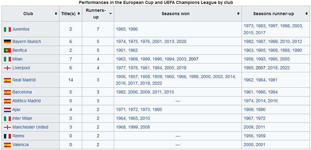 Na stranici s popisom svim finala Lige Prvaka (Kupa Prvaka) ima i “Performances” dio, sa sekcijom “by club”, i kad se sortira po kriteriju tko je najviše puta izgubio u finalu, dobije se sljedeća tablica: