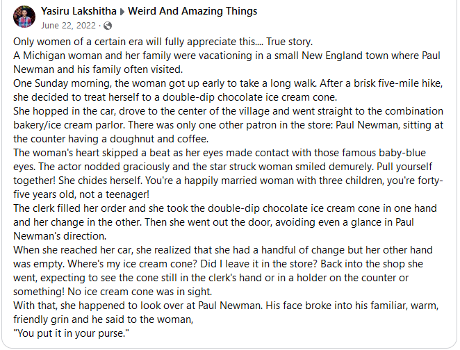 She hopped in the car, drove to the center of the village and went straight to the combination bakery/ice cream parlor. There was only one other patron in the store: Paul Newman, sitting at the counter having a doughnut and coffee.