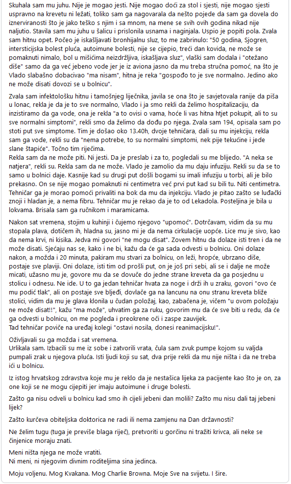 Čitajući jutros ovaj opis zadnjih sati i dana Vladimira Matijanića, odmah, ali odmah mi se, pored svog opisa te silne tuge, bijesa i nesposobnosti bolničkog sustava, jedna rečenica urezala u pamćenje: