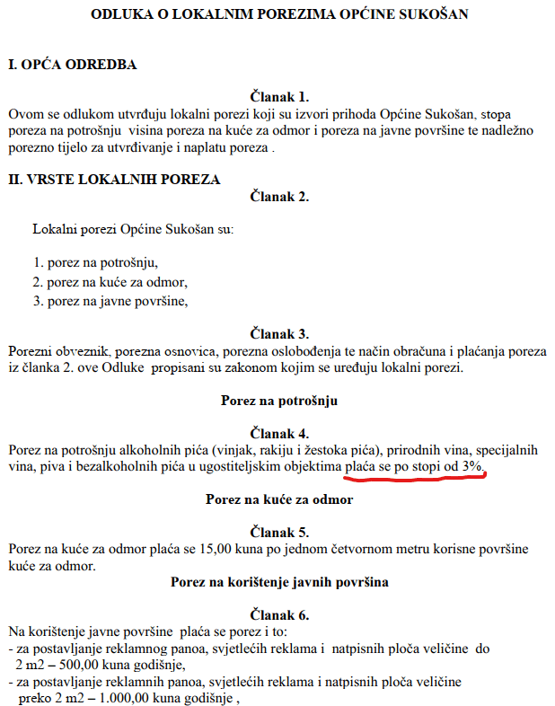 Prvo, zato što stavlja i malo drugačiju sliku na one sukošanske ugostitelje koji dio posla obavljaju “na crno”, time direktno oštećujući općinski proračun (znači, svi? 🙄), a drugo, zato što ne pamtim da sam ikad na računima vidio, ili barem zapamtio da sam vidio tih dodatnih naplaćenih 3% poreza?