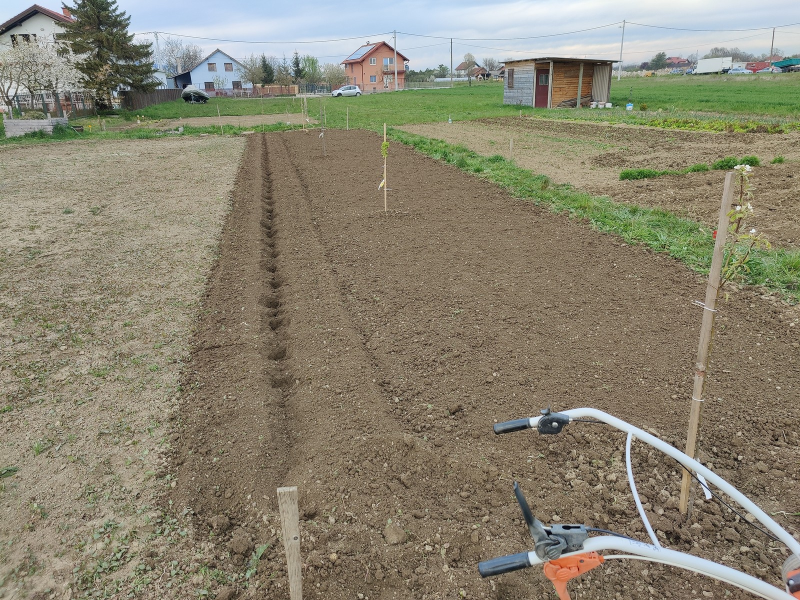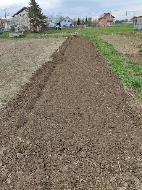 I nema tu više neke velike filozofije. Prođeš, napraviš brazdu, u nju pozabadaš krumpire, onda prođeš još jednom frezom da to zatrpaš, pa kontra smjer priprema za idući red, onda to malo poravnaš … rinse and repeat 😎.