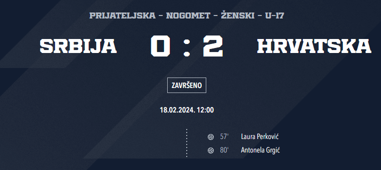 Danas su, u završnom ogledu na tom mini gostujućem kampu u Beogradu, pobijedile djevojke iz Srbije 2 : 0, i s time je odrađen i zadnji test prije ključnih utakmica, ogleda s Austrijom, Belgijom i Mađarskom početkom ožujka, u završnoj rundi kvalifikacija za EURO 2024.