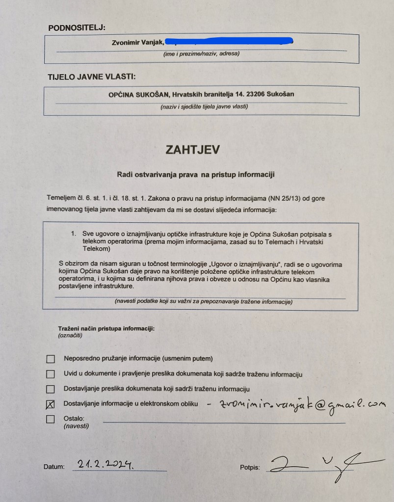 Ovaj prvi je u neku ruku trivijalan, tražim na uvid ugovore koje je Općina potpisala kod davanja postavljene optičke infrastrukture u najam, to će gđa Zdenka Banović, povjerenica za informiranje u Općini nadam se riješiti u par minuta, poslati mi na mail ta dva PDF dokumenta i stvar riješena.