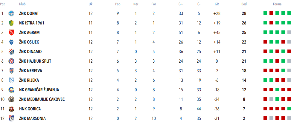 Za početak, podsjetnik na stanje tablice nakon odigranih 11 kola jesenskog dijela: