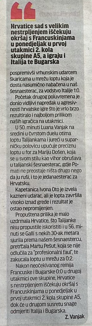Djevojke se sad okreću ogledu s Francuskom u ponedjeljak. Koja je neočekivano odigrala samo 0 : 0 s Bugarskom i koje očito nisu ni blizu tako dobre koliko se to očekivalo, tako da je do raspleta u ovoj skupini još daleko (uz podsjetnik da je glavni i osnovni imperativ ne biti zadnji, jer to vodi na eliminaciju iz druge runde kvalifikacijskog ciklusa).