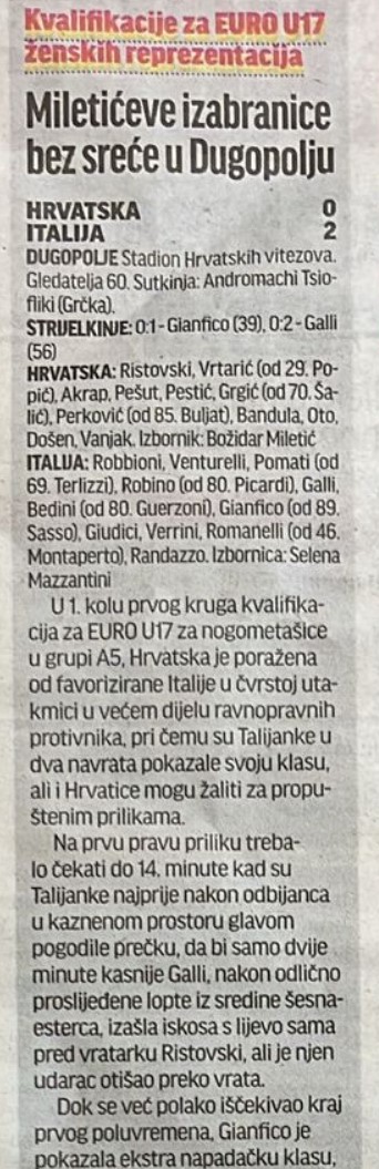 U najkraćim crtama rečeno – u uvelike ravnopravnoj utakmici, Talijanke su u dva navrata prezentirale svoju ekstra klasu postigavši dva jako lijepa i efektna gola, dok su Hrvatice priliku za vraćanje u utakmicu kod vodstva 1 : 0 za Talijanke propustile kad je Ivona Oto u 50-toj minuti promašila jedanaesterac.