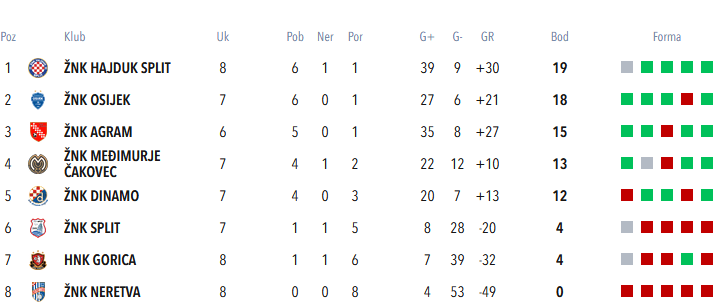 Ali, to je samo privid, jer Agram s 15 bodova na trećem mjestu ima DVIJE utakmice manje od Hajduka na prvom mjestu, koji ima 19 bodova.