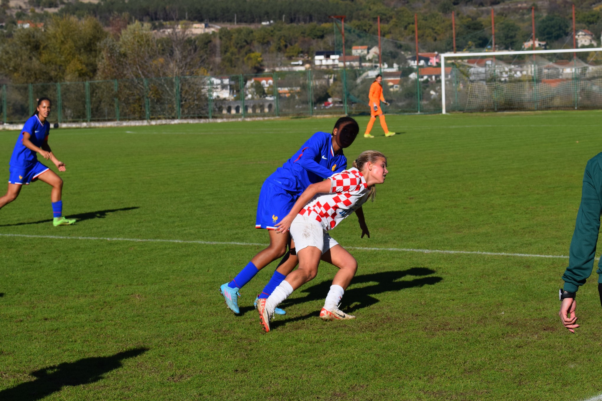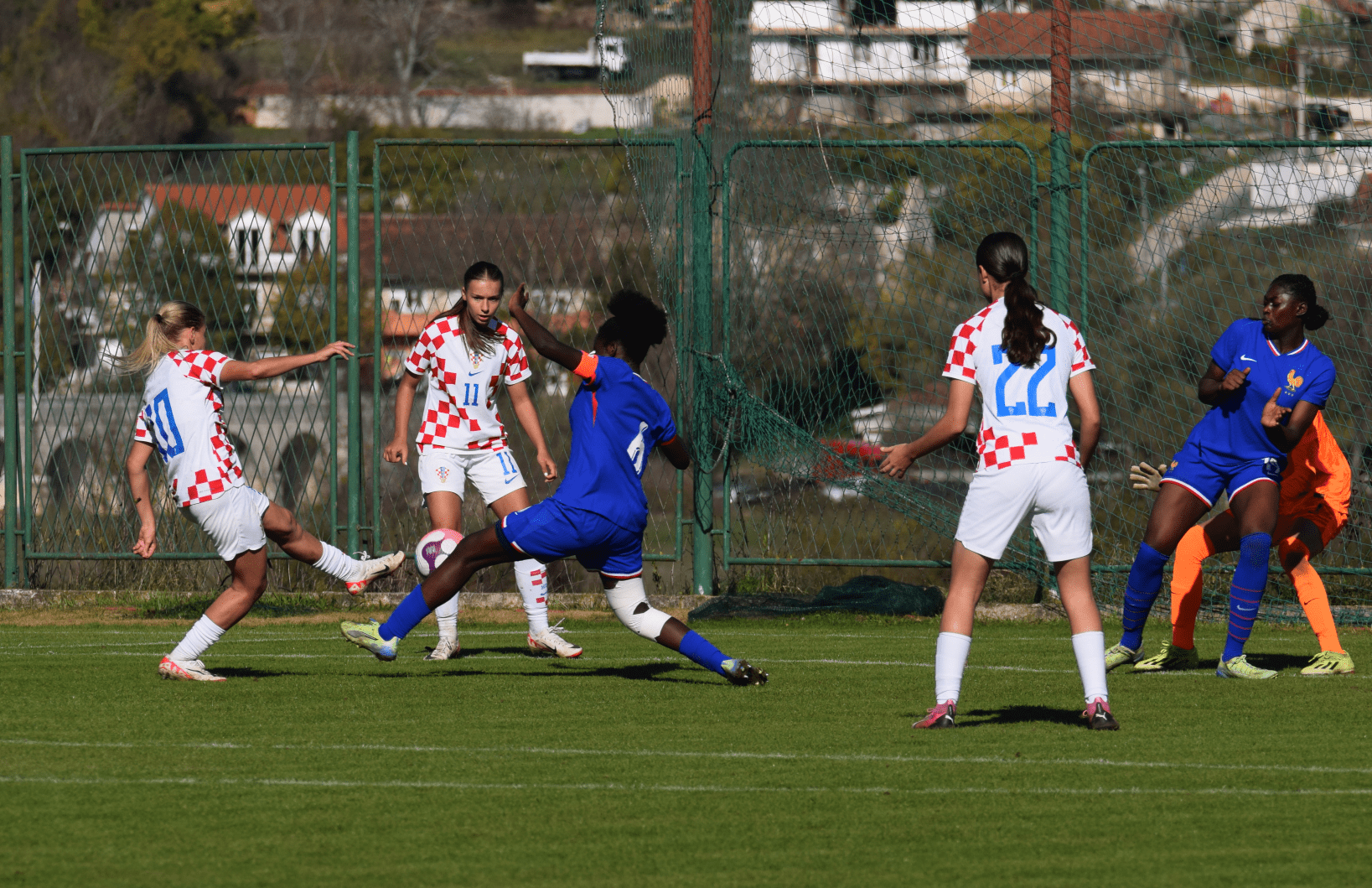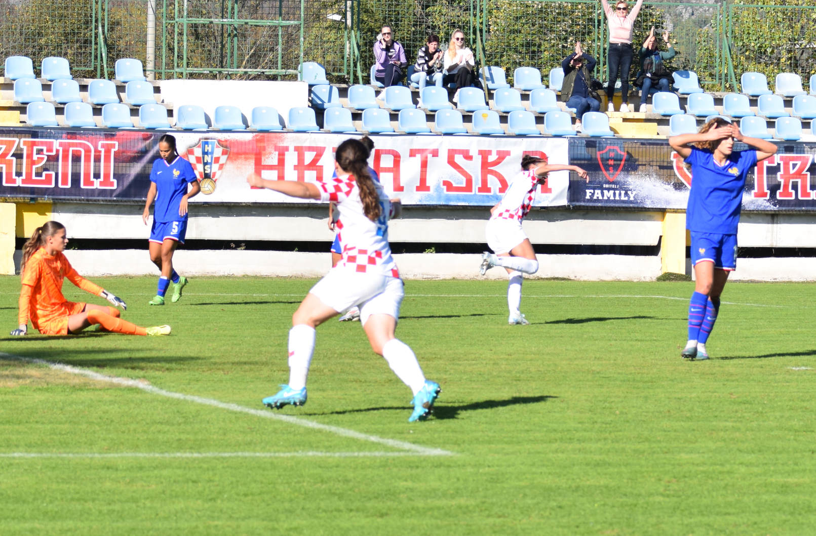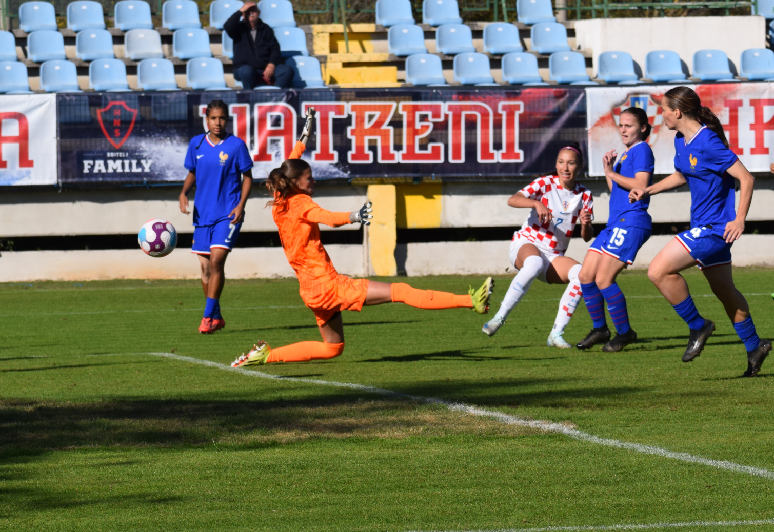 U jednom napadu najprije je bio relativno opasni slobodni udarac iskosa s lijeve strane, koji smo uspješno otklonili, ali je nakon toga u nastavku francuskog napada došao nabačaj s desne strane, koji je glavom izbila Marta, ali se lopta odbija do Francuskinje na rubu šesnaesterca, čisti poluvolej … koji junački blokira Marija … “aaa, živi smo” … no lopta se opet odbija do Francuskinja i sad ide udarac po zemlji izvana … “aaa, gotovooo jeee” … ali Laura Perković na desnoj stativi spašava čisti gol … ” je li više gotovo, neba ti” … nijeee, lopta je opet kod Francuskinja … al’ falin te Bože, udarac odlazi preko vratnice i spašeni smo.