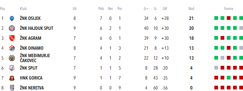 Gledajući tablicu, za Agramerke je stvar jasna – pobjedom nad Dinamom u srijedu u nadoknadi 5. kola se izjednačuju s Osijekom po broju bodova (i odigranih utakimica!) ali i preuzimaju vrh tablice zbog bolje gol razlike.
