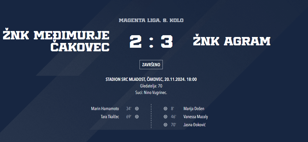 Sigurno najuzbudljivija seniorska utakmica ekipe Agrama koju sam ja ikada gledao, u kojoj su gotovo pa cijelo drugo poluvrijeme Agramerke igrale s igračicom manje zbog crvenog kartona Lee Kolčić, ali su to i više nego kompenzirale junačkom borbom i neviđenom agresivnošću, uspjevši i nakon izjednačenja Međimurja na 2 : 2 snaći snage za novo vodstvo koje su u dramatičnoj borbi uspjele i sačuvati do kraja za veličanstvenu pobjedu!