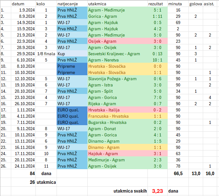 Umor je sasvim sigurno imao svoje prste u prorijeđivanju golova i asistencija u zadnjih par tjedana polusezone, pri čemu je situacija bila najkritičnija nakon povratka iz WU-17 reprezentacije. Totalno izmorena nakon tri utakmice u sedam dana, nakon zadnje utakmice s Bugarskom u četvrtak već u subotu je trebalo odigrati kadetski derbi s Donatom, pa odmah u nedjelju protiv Gorice u Prvoj HNLŽ, pa tri dana kasnije u srijedu odraditi nadoknadu protiv Dinama, pa u subotu kadetski ogled protiv Dinama i u nedjelju putovanje u Split na noge Hajduku 🙄😮.