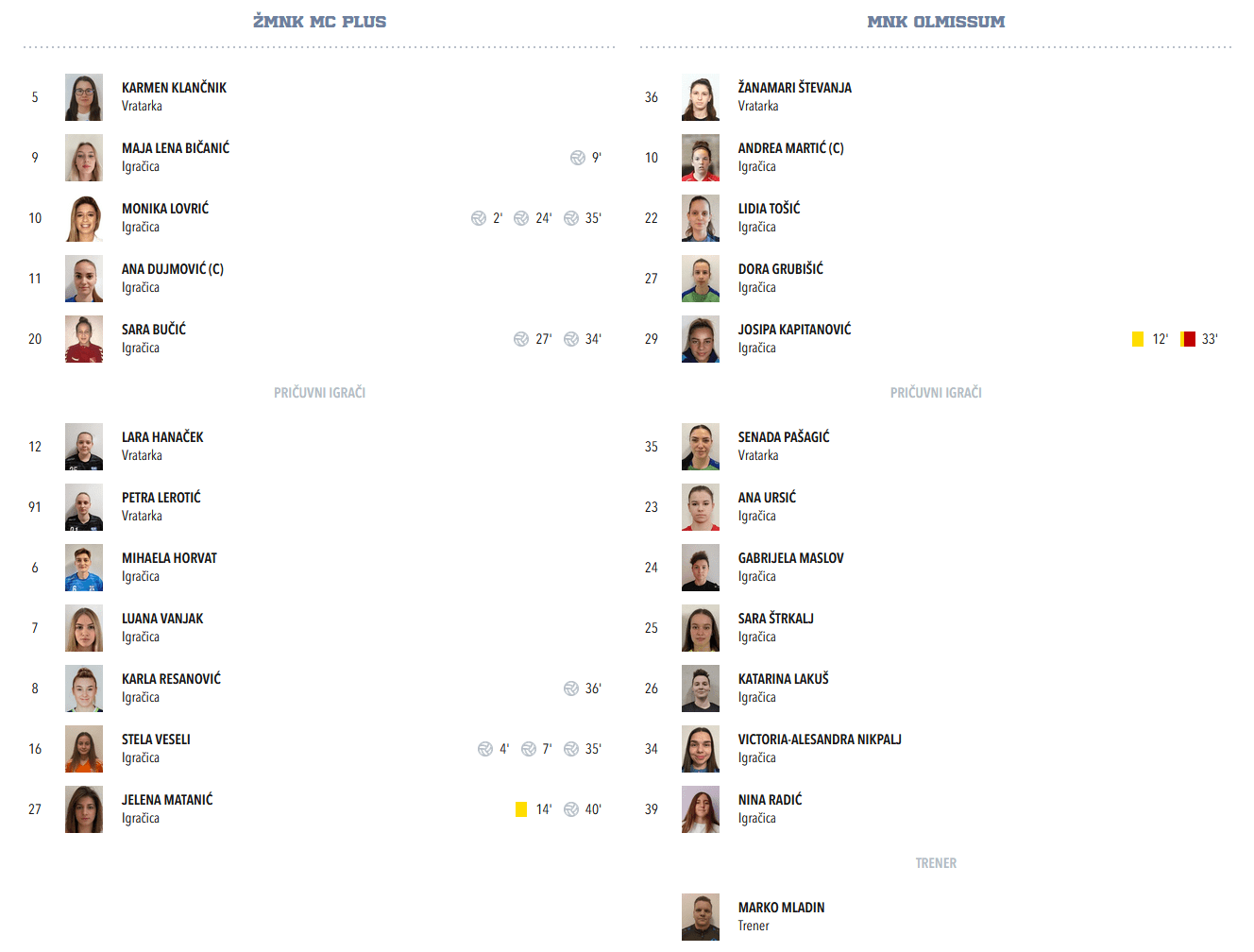 Nakon tri gola ekipe MC Plusa za 3 : 0 u prvih sedam minuta, najbolja, i to daleko najbolja igračica Olminussa Josipa Kapitanović je počela lagano gubiti živce i dobila žuti karton u 12. minuti, što je nije nimale poremetilo u tome da i dalje vrlo grubo nasrće u duelima na igračice MC Plusa, a što je nakon par faulova i jednog jako grubog nasrtaja na Maju Bičanić rezultiralo i crvenim kartonom u 33. minuti.