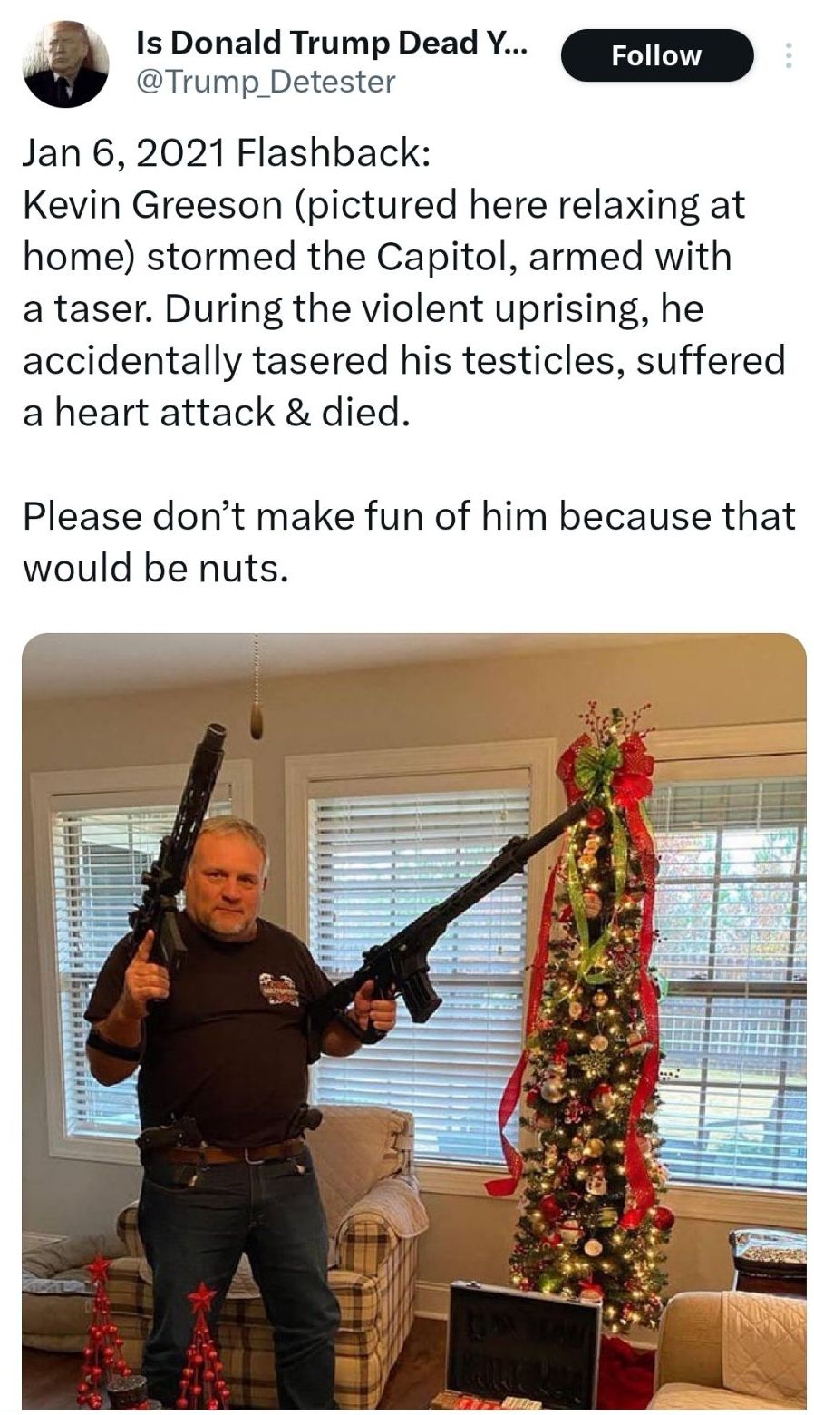 Mislim, malo se grubo zajebavati na račun čovjeka koji je tazerom sebi spržio jaja i onda umro od srčanog, ali … ČOVJEK JE SAM SEBI TAZIRAO JAJA 🤣🤣🤣🤣.