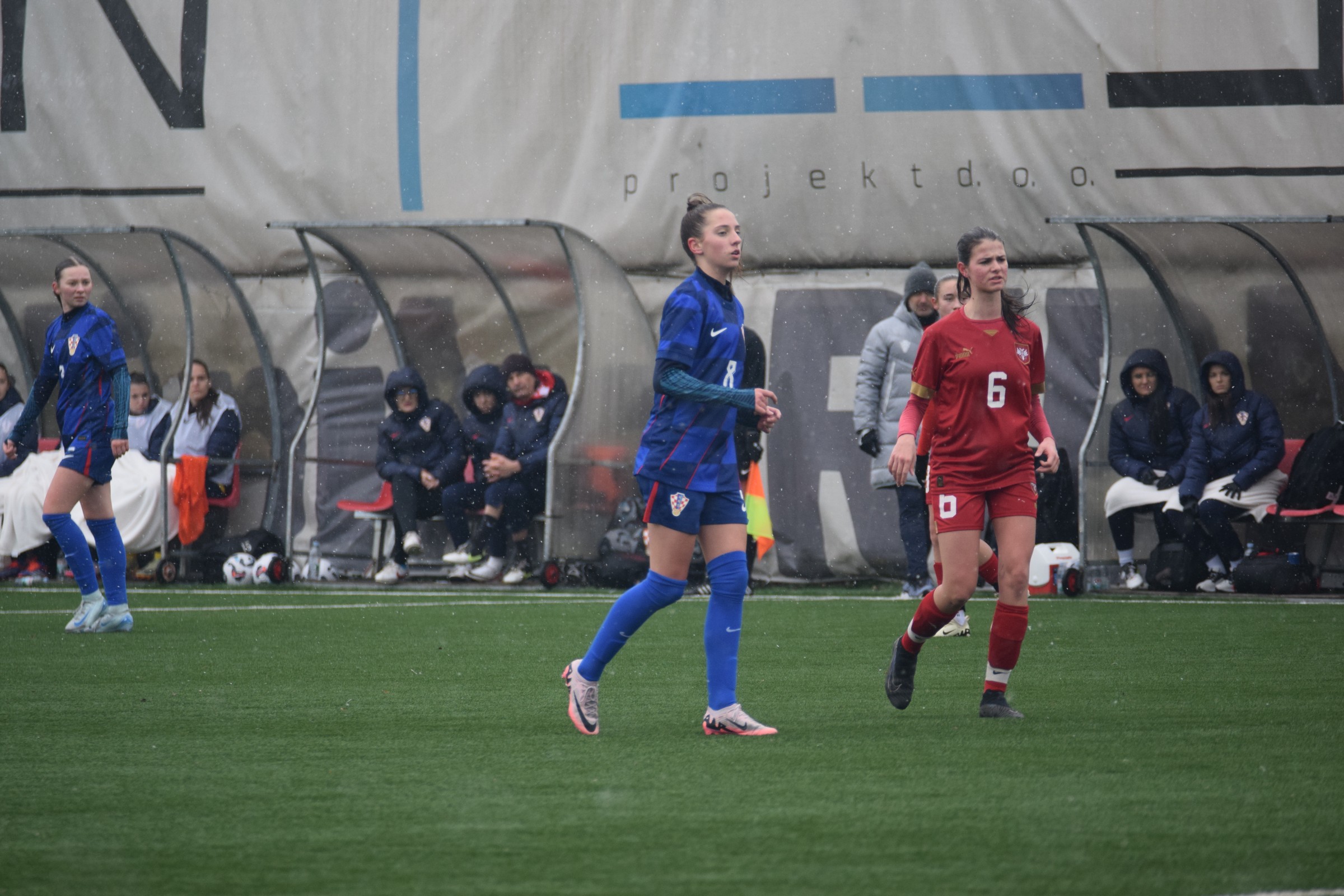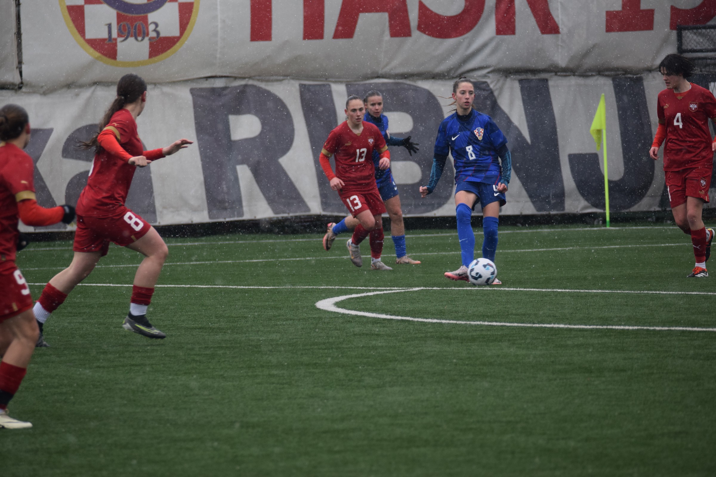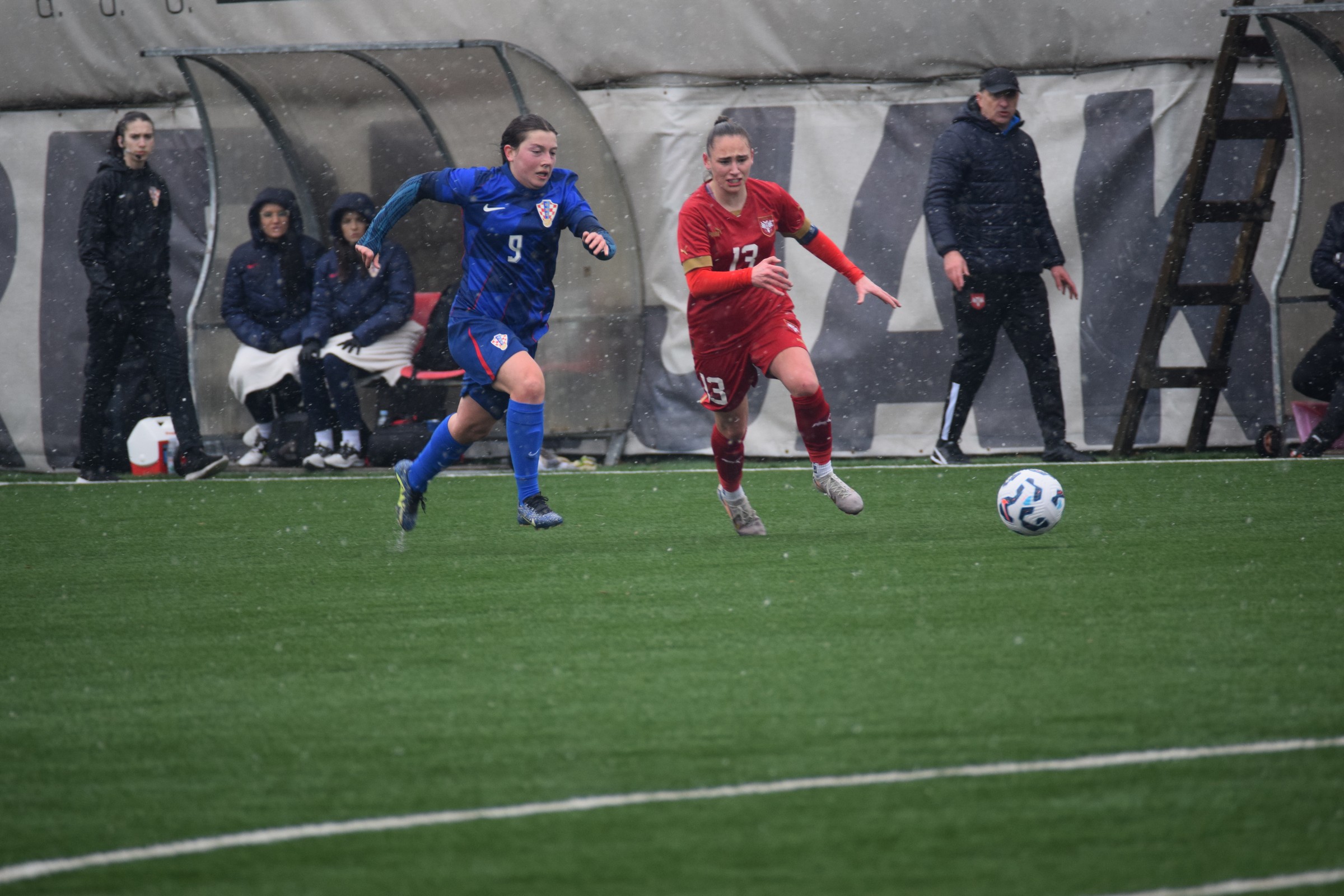 U vrlo teškim vremenskim uvjetima, na temperaturi malo iznad nule i sa snijegom koji je padao cijelo prvo poluvrijeme, Hrvatice su puno bolje ušle u utakmicu i tijekom cijelog prvog poluvremena bile bolja ekipa na terenu. Izostanci Petre Bandule i Luane Vanjak u sredini, te Lane Popić i Laure Perković na lijevom boku su prisilili izbornika Miletića na rošade u momčadi i odustajanje od uobičajene 3 – 5 – 2 formacije, te prelazak na nešto klasičnijih 4 – 3 – 3, i s Antonelom Grgić, Marijom Došen i Magdom Vrtarić u vrhu napada, koje su svojim konstantnim pritiskom na zadnju liniju obrane stvarale velike probleme srpskoj momčadi, i vrlo čvrstom kontrolom sredine gdje su ordinirale Mia Pestić, Ivona Oto i Marta Pešut, igra hrvatske reprezentacije je izgledala dosta dobro.