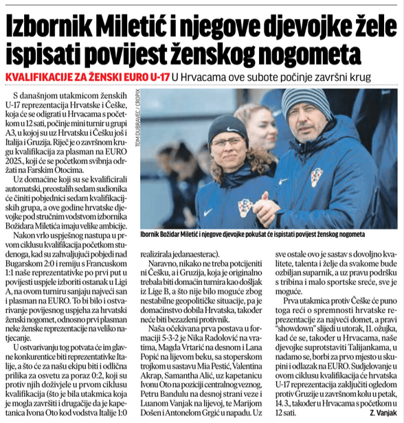 Prva utakmica protiv Češke će puno toga reći o spremnosti hrvatske reprezentacije za najveći domet, a pravi showdown slijedi u utorak, 11.3., kad će se, također u Hrvacama, naše djevojke suprotstaviti Talijankama, u nadamo se, borbi za prvo mjesto u skupini i odlazak na EURO. Sudjelovanje u ovom ciklusu kvalifikacija će naša reprezentacija zaključiti ogledom protiv Gruzije u završnom kolu u petak, 14.3., također u Hrvacama s početkom u 12 sati.