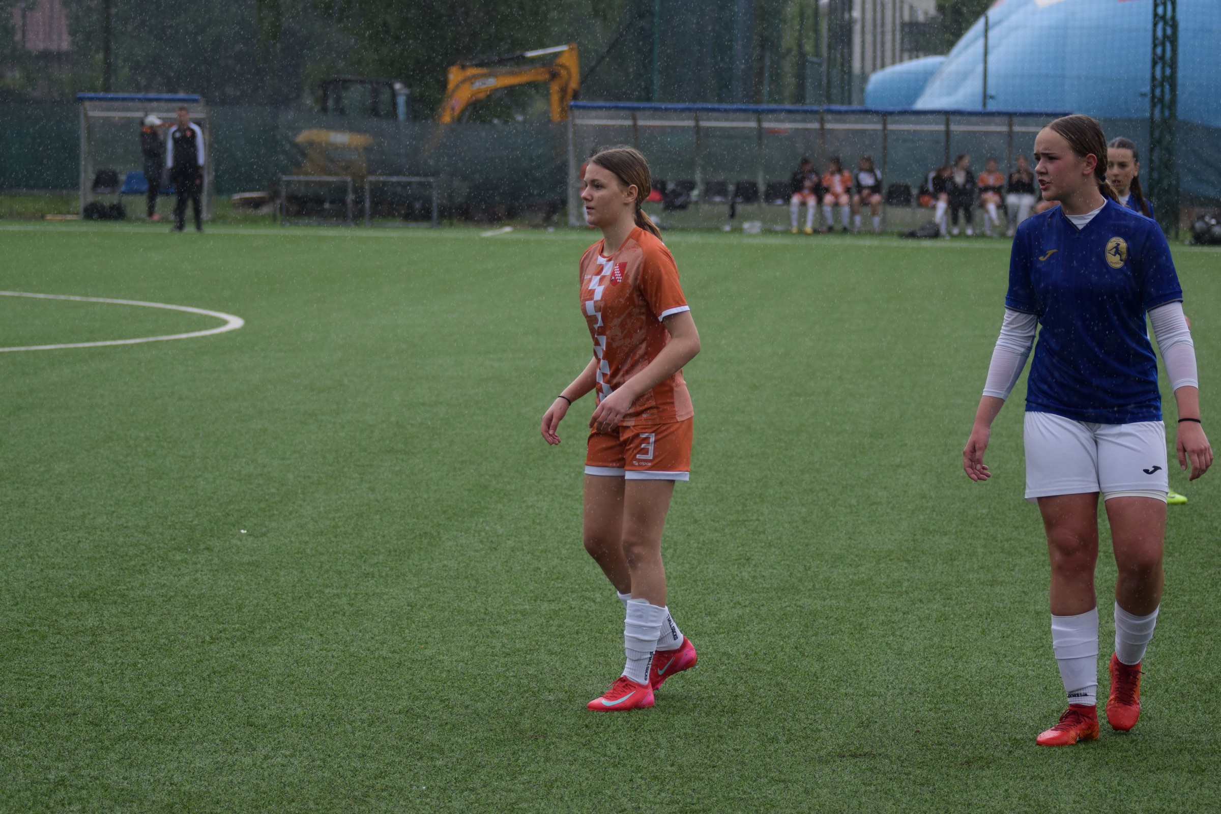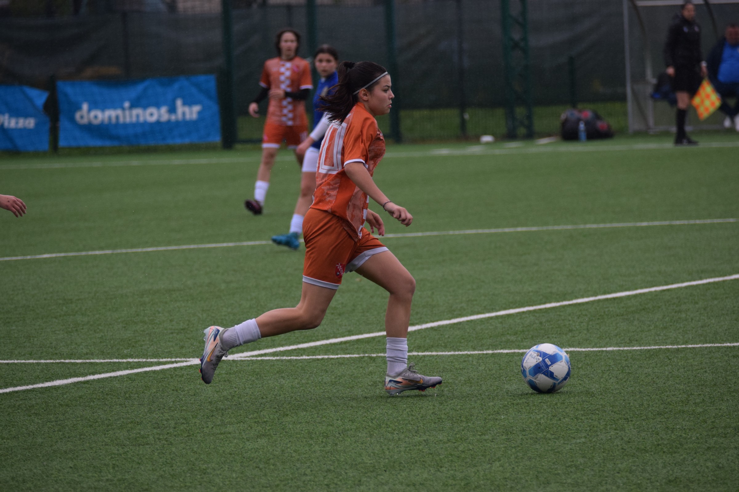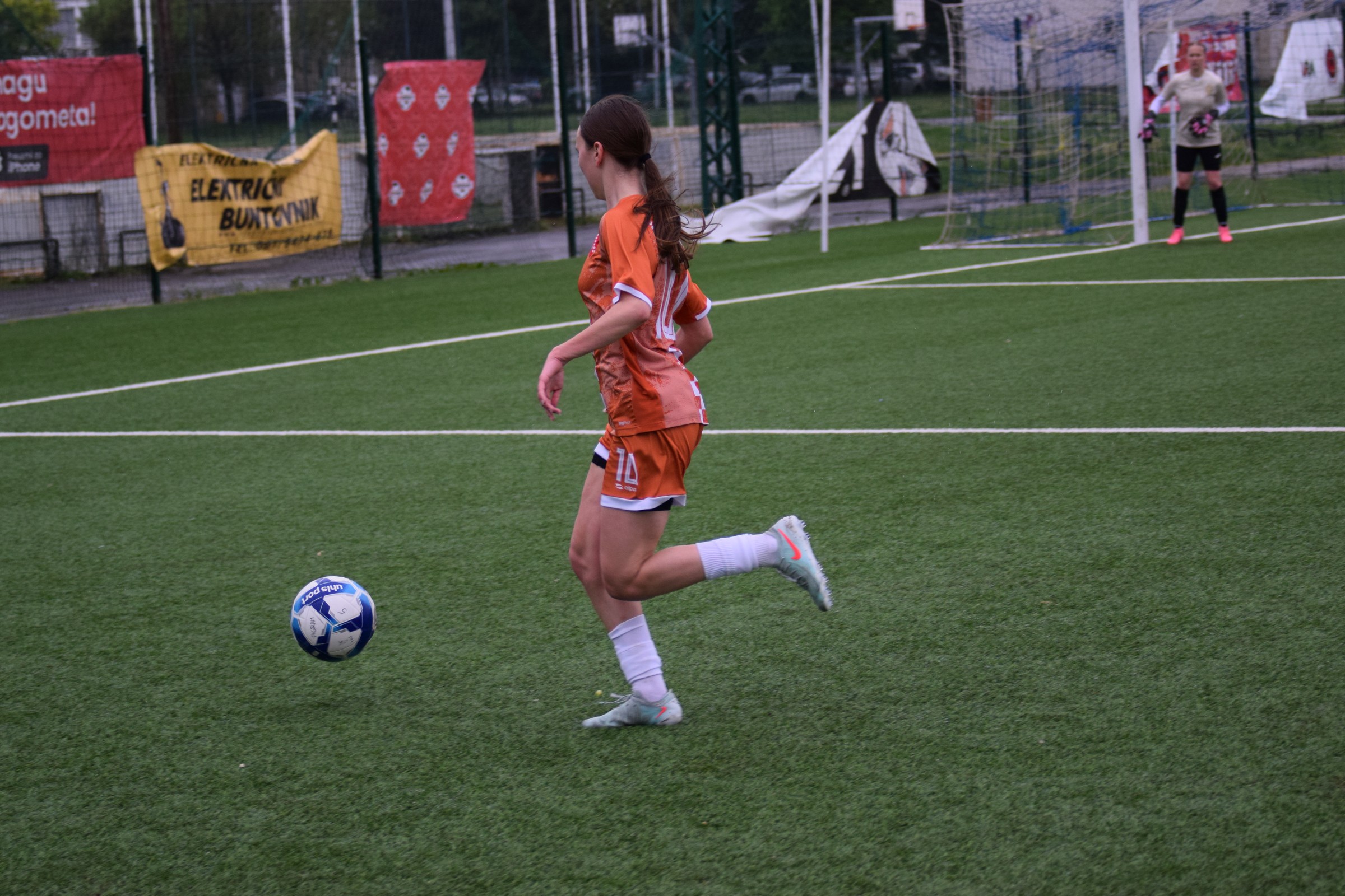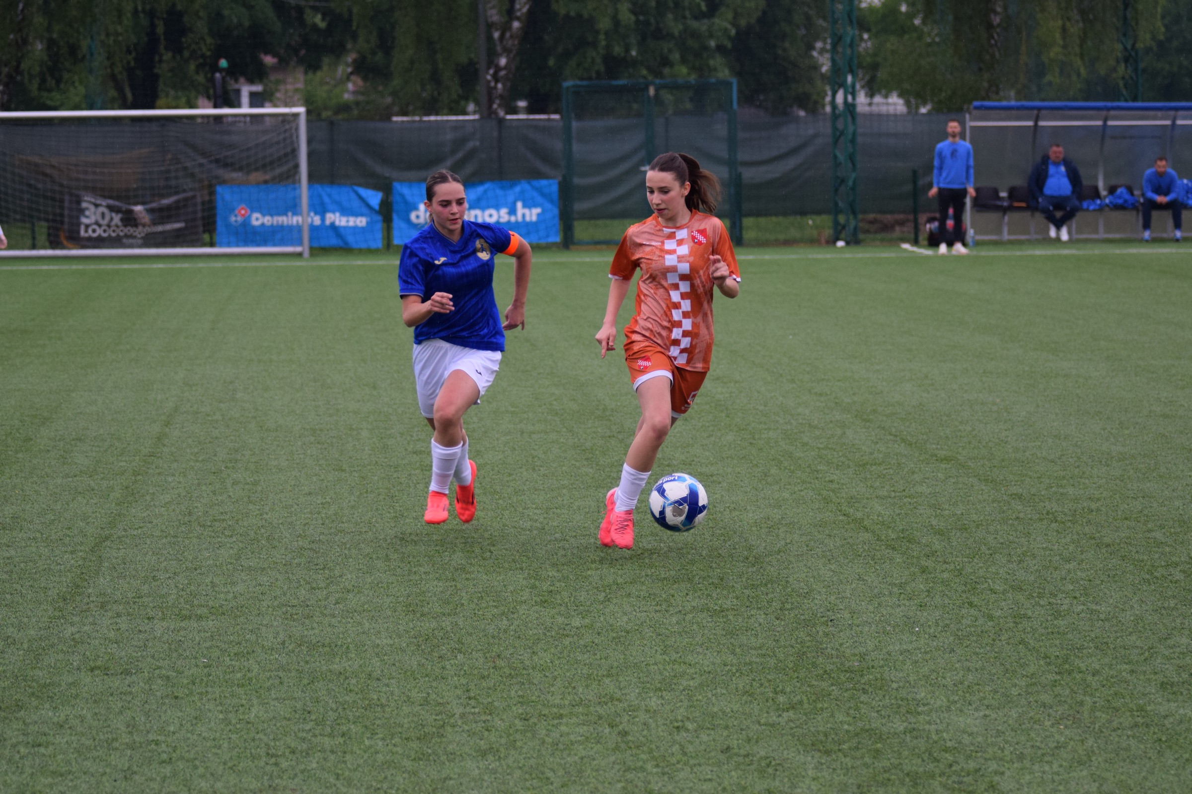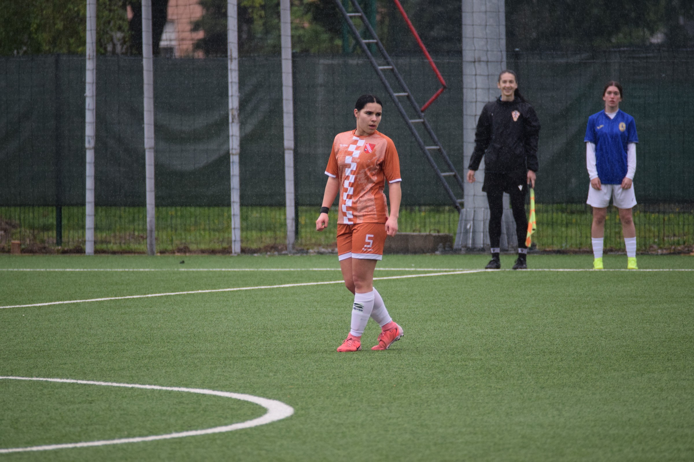 Daleko bolji pogled, snimio sam i par videa, a i bio mi je više pun đolenko kiše koja je padala cijelu utakmicu pionirki – držati istovremeno u lijevoj ruci kišobran, u desnoj fotoaparat, s time da svako malo tu lijevu ruku moraš podignuti (jer s njom pridržavam teleobjektiv) i onda mahnito podešavati fokus … umorih se 😂.