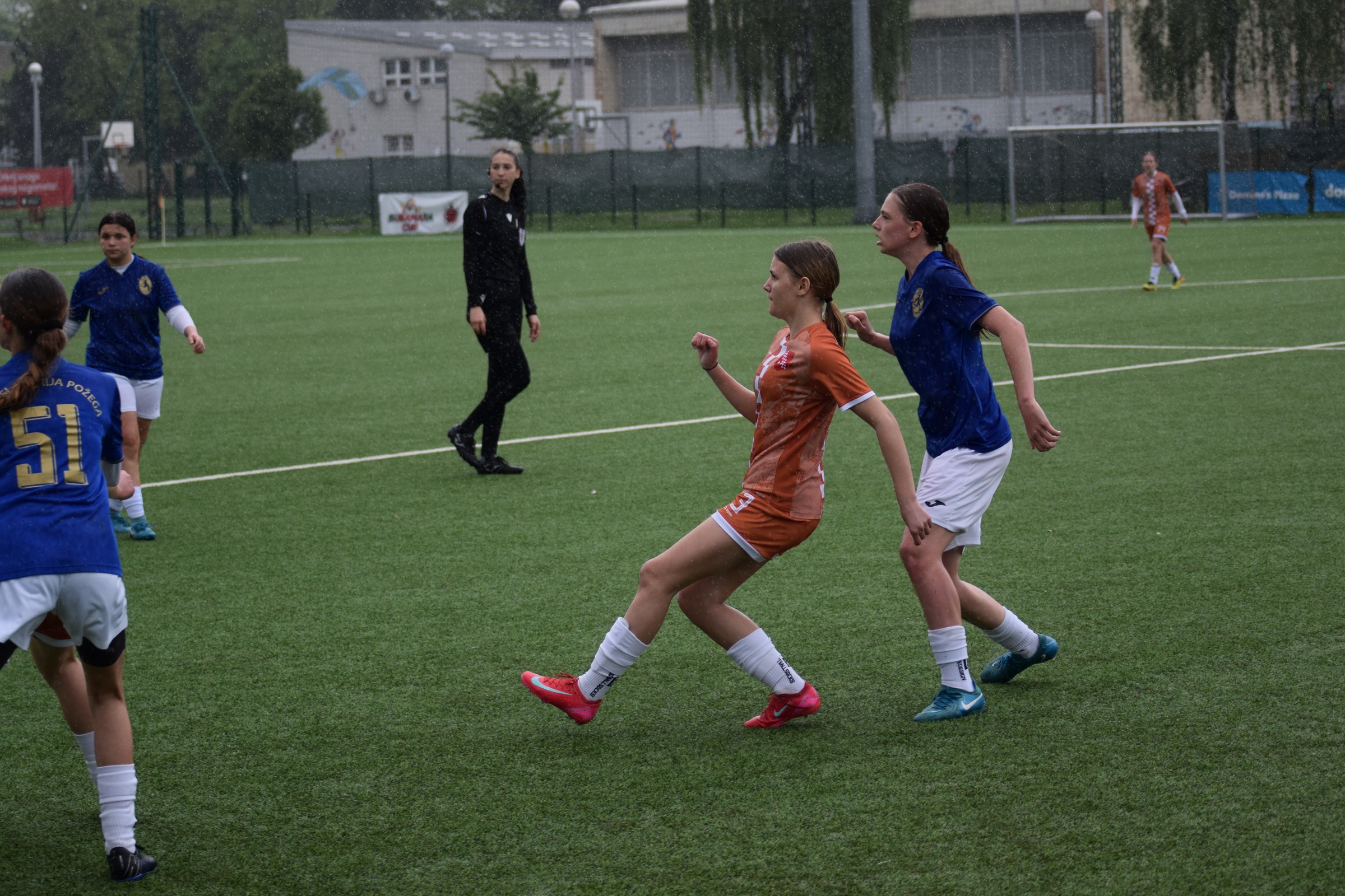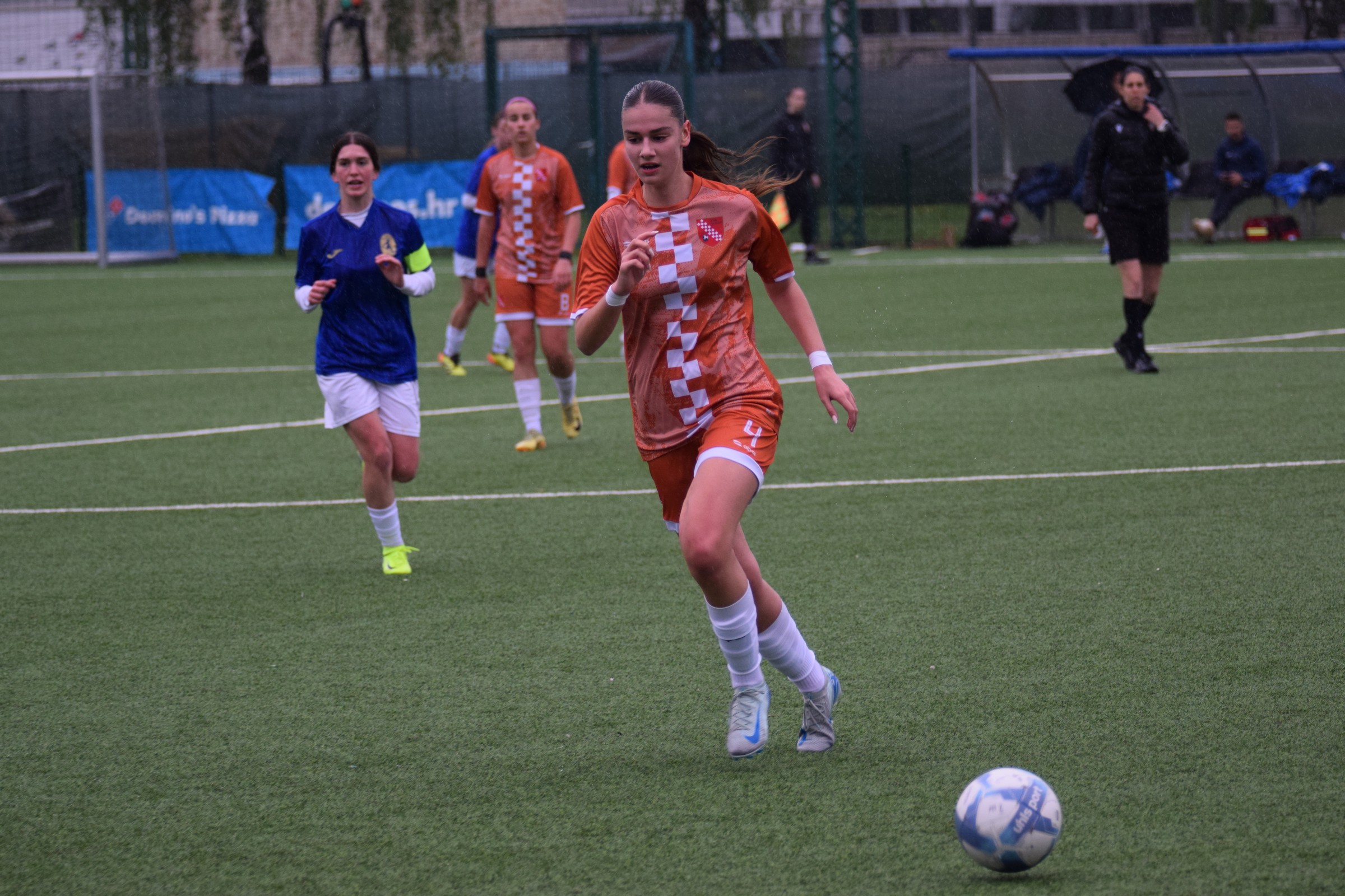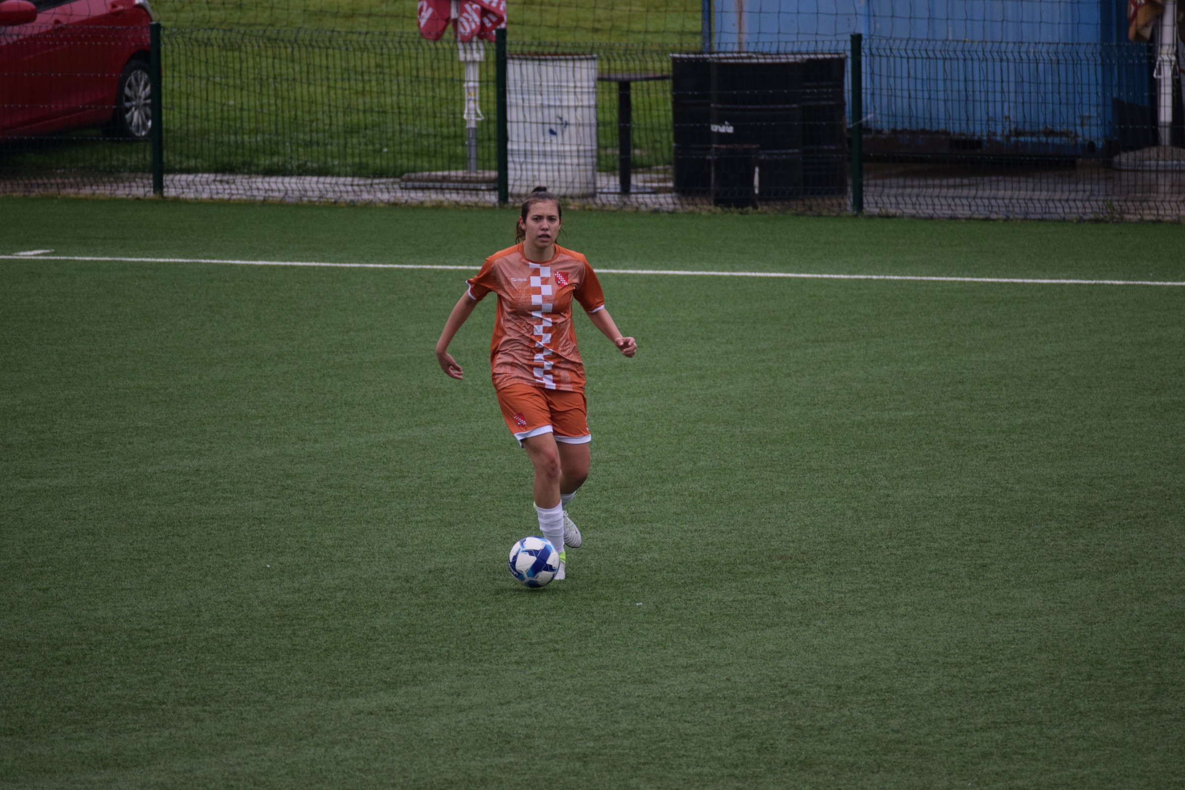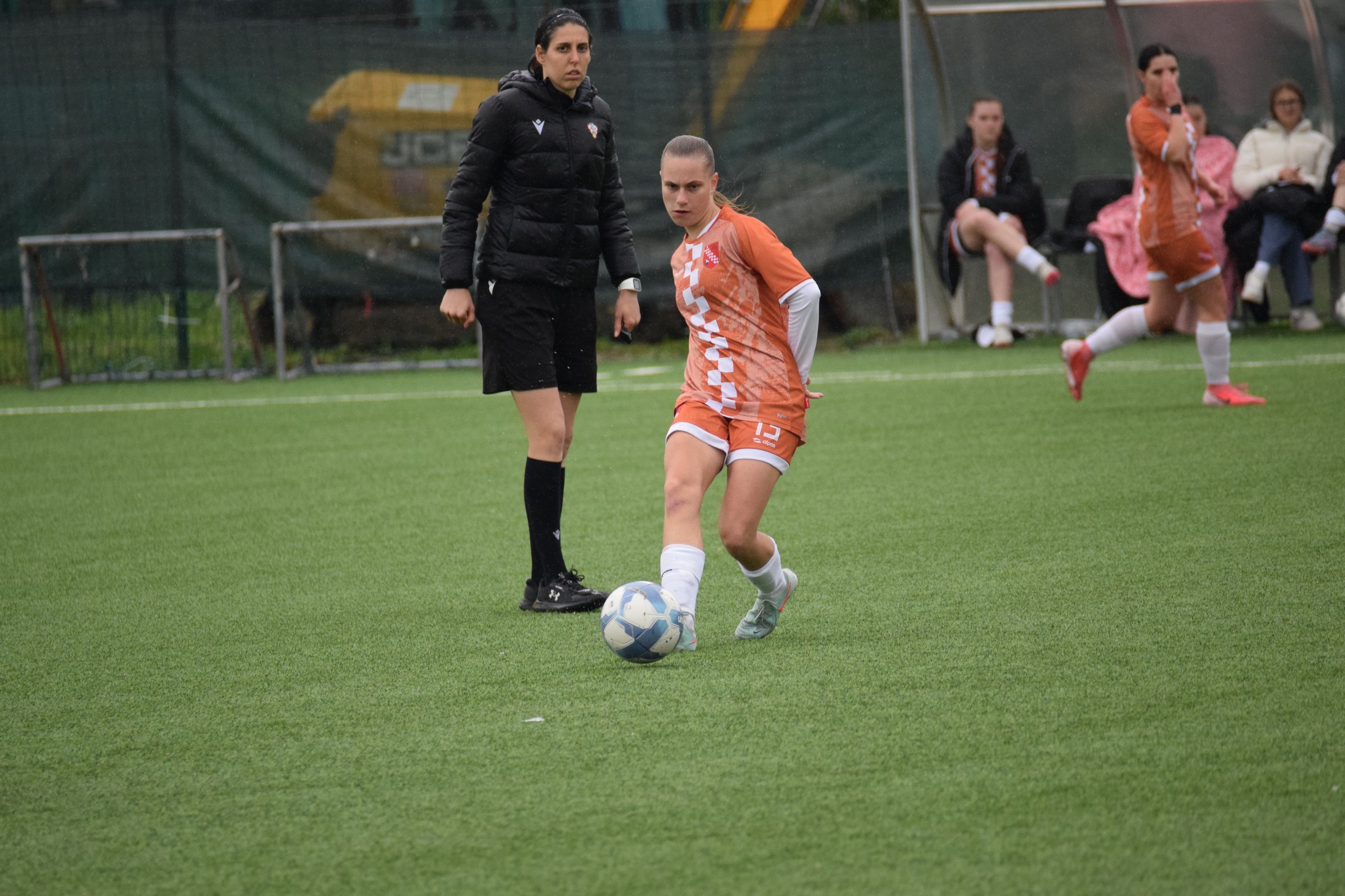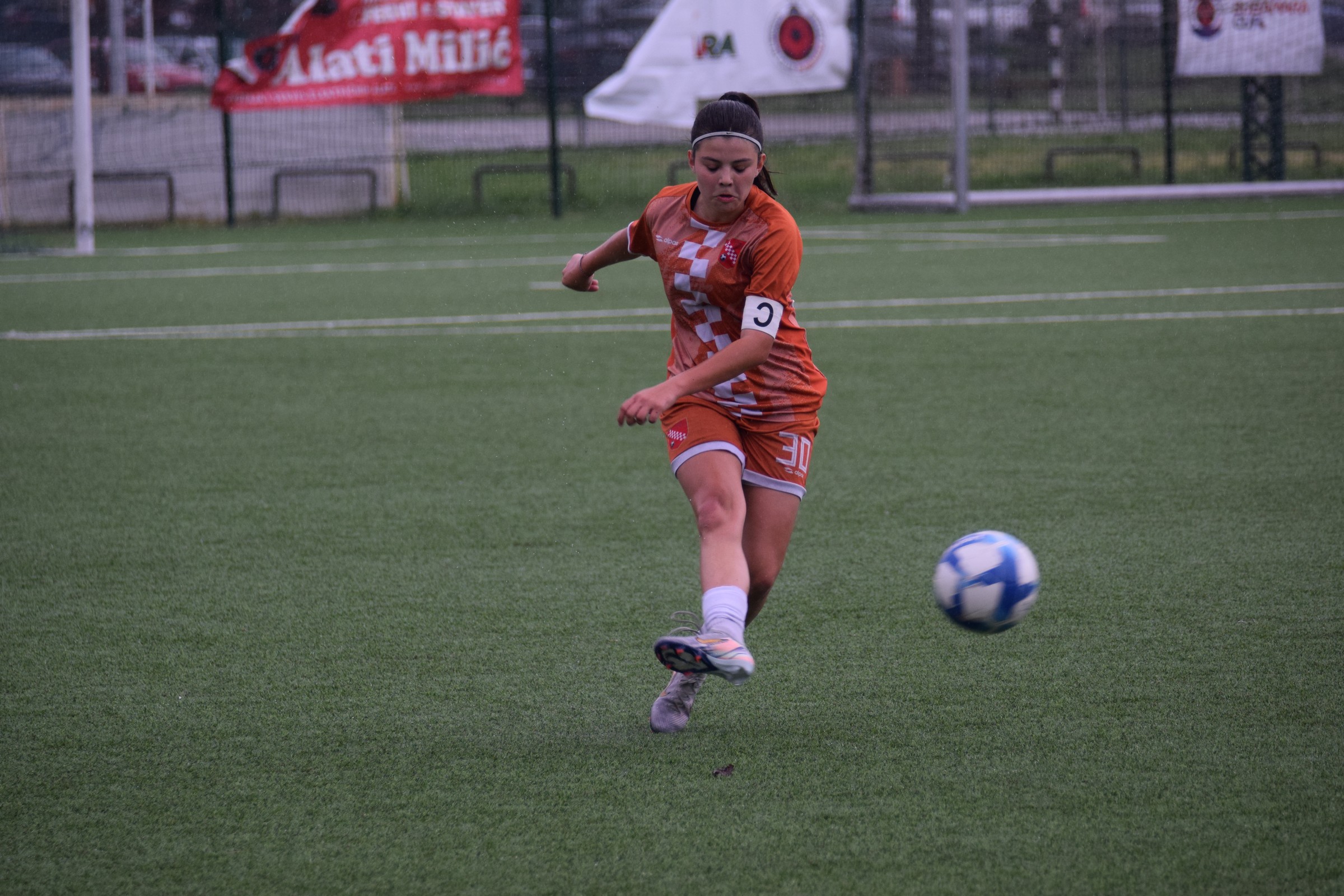 Daleko bolji pogled, snimio sam i par videa, a i bio mi je više pun đolenko kiše koja je padala cijelu utakmicu pionirki – držati istovremeno u lijevoj ruci kišobran, u desnoj fotoaparat, s time da svako malo tu lijevu ruku moraš podignuti (jer s njom pridržavam teleobjektiv) i onda mahnito podešavati fokus … umorih se 😂.