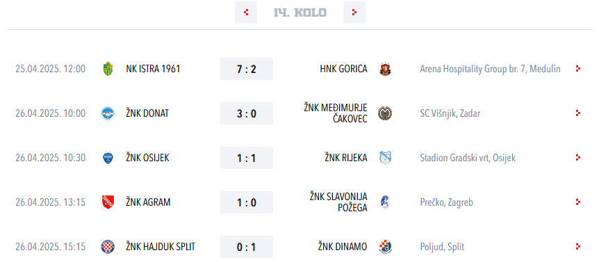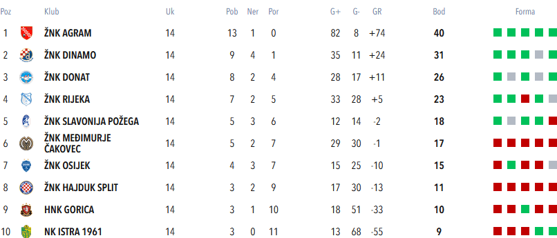 S ovom pobjedom Agramerke su zadržale pet bodova prednosti pred Dinamom, koji je danas pobijedio Hajduk u gostima 4 : 3. Funny thing, Hana Mušinović je zabila četiri gola u prvom poluvremenu, onda je na poluvremenu Ana Grdiša izašla iz igre … i Dinamo je primio tri komada 🤔😂. Da su primili još jedan prvenstvo bi bilo kompletno gotovo.
