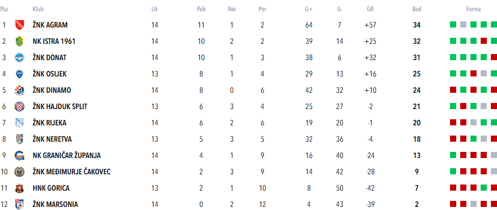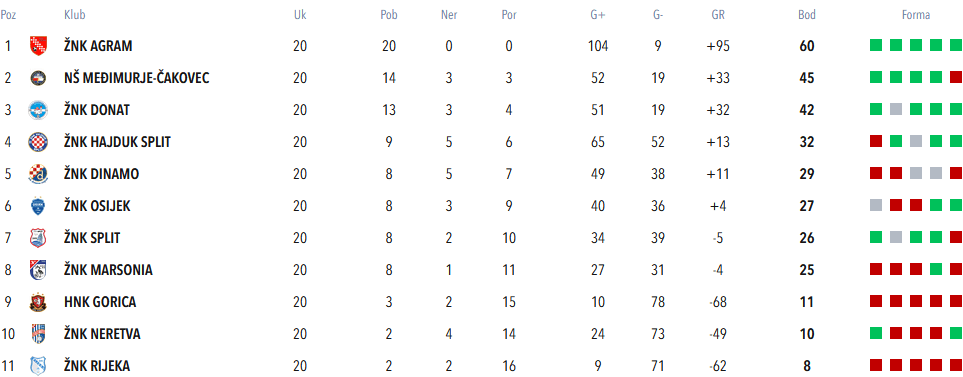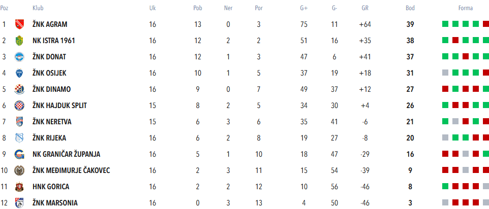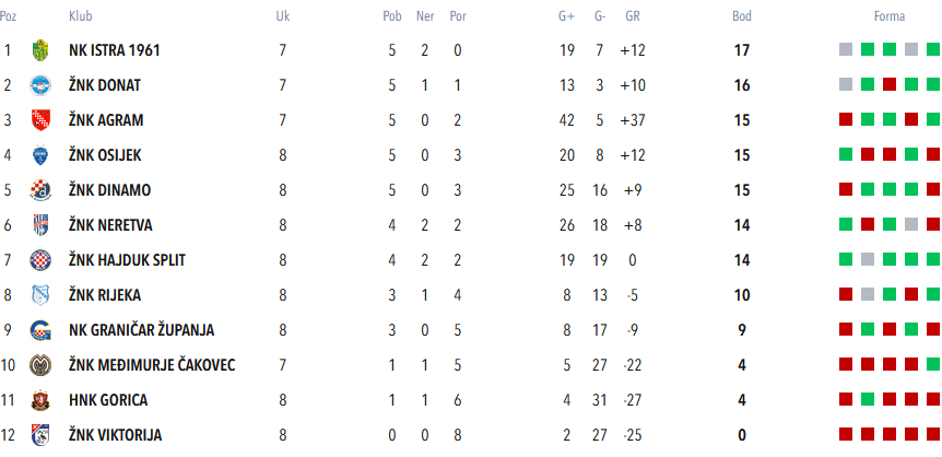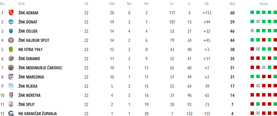 A tablica, kaotična i s puno neodigranih utakmica, je nakon toga Agramerkama davala nadu. Dva boda zaostatka za Istrom, s kojom su imali nadoknaditi domaću utakmicu 5. kola, i zaostala utakmica s Viktorijom … da se stigne Donat.