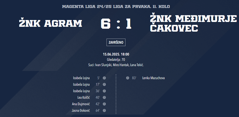 Iako je Međimurje prije ove utakmice možda i gajilo neke nade da bi se mogle pocipati s Hajdukom za treće mjesto (, Agramerke nisu pokazale nimalo razumijevanja za te nade, Izabela Lojna je u prvom poluvremenu postigla hat-trick 💪💪💪 i to je bilo to.