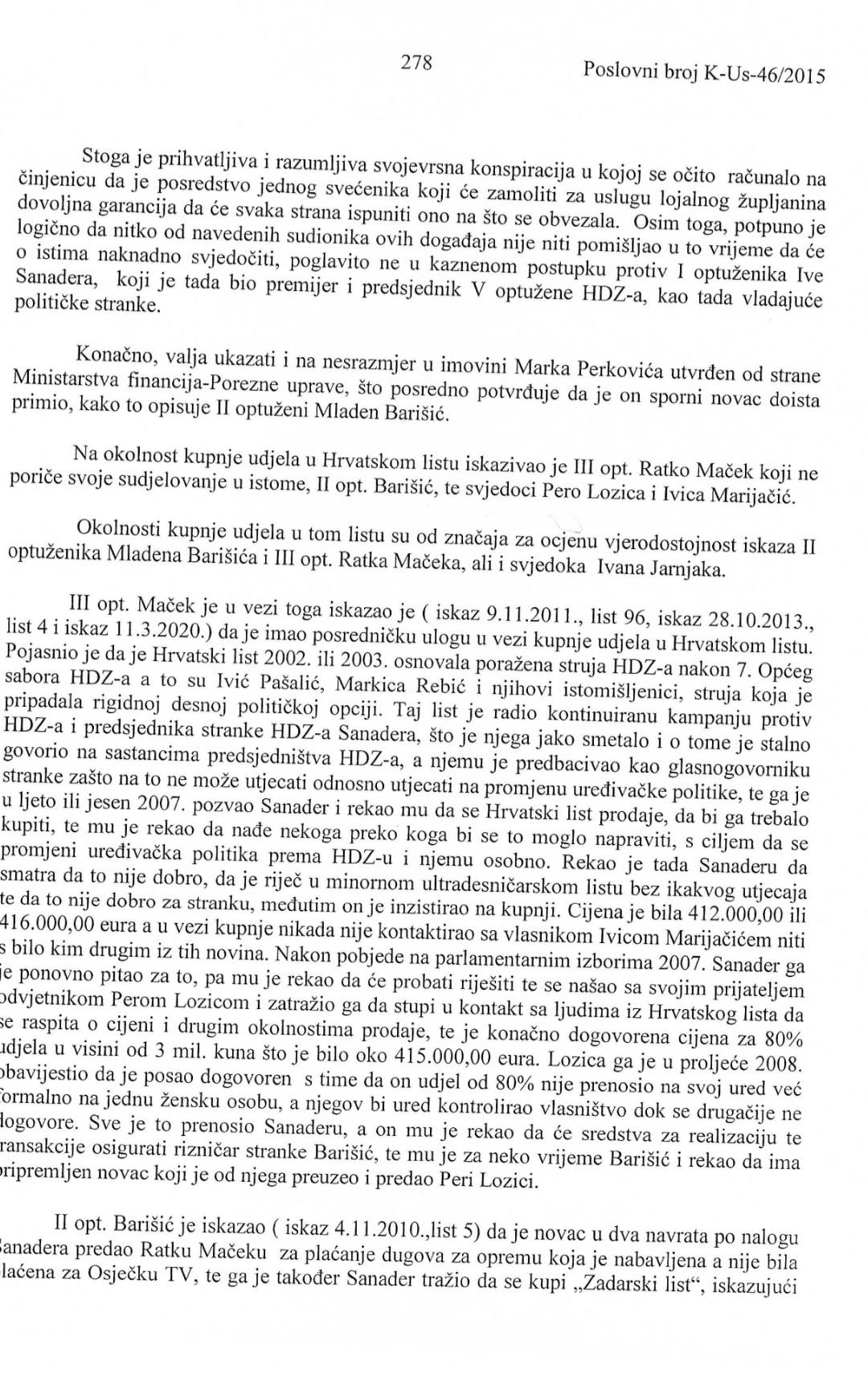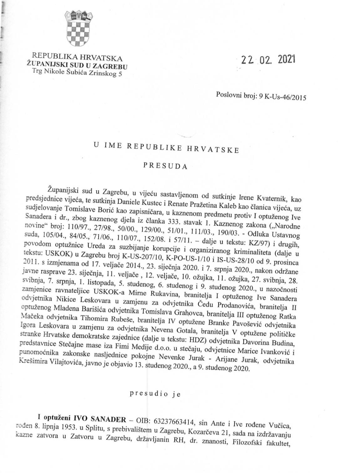 “Dokaz da je Thompson od Ive Sanadera primio 500.000,00 eura ukradenih iz državnih tvrtki i institucija u aferi Fimi media sadržan je u presudi Županijskog suda u Zagrebu 9 K-Us-46/2015.