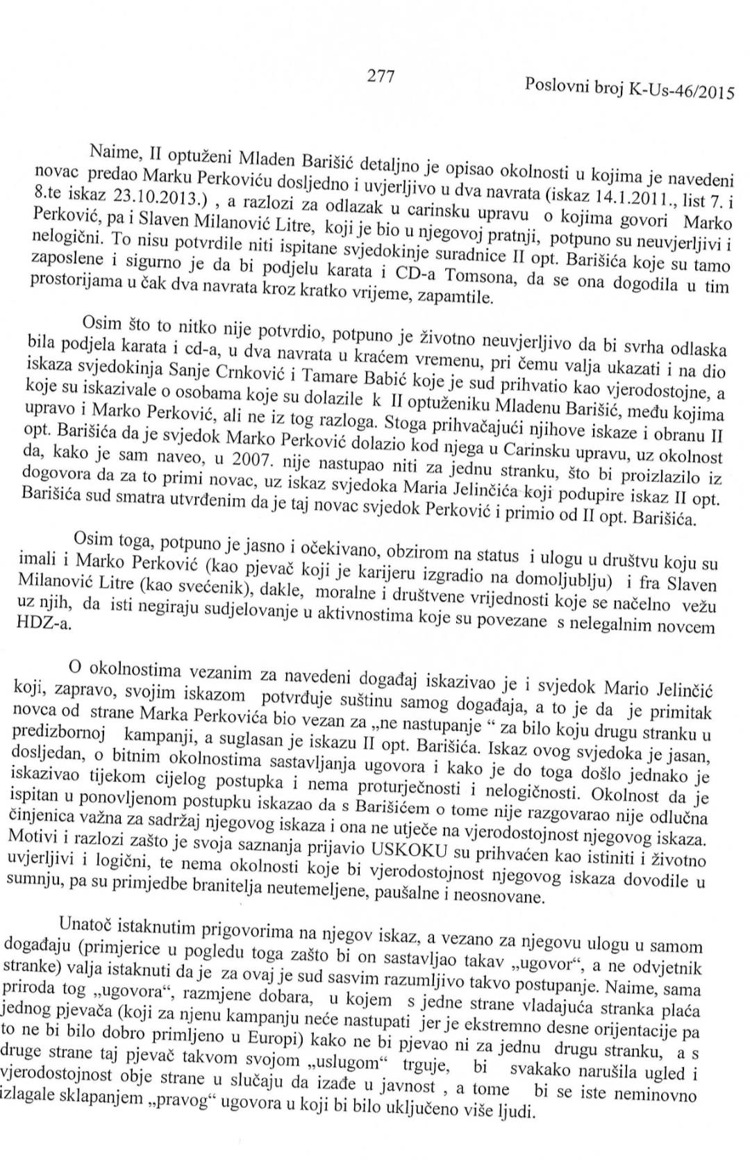 Stranice 5., 275, 276, 277, i 278 treba čitati kao povijesni dokument u kojem je opisano kako u ono vrijeme (2007.g.) HDZ nije mogao angažirati Thompsona da nastupa u njihovoj kampanji jer je ekstremno desne orijentacije pa to ne bi bilo dobro primljeno u Europi, a nije mogao niti s njim sklopiti pisani ugovor o nenastupanju za druge političke stranke jer bi to i HDZ i Thompsona kompromitiralo u javnosti. Stoga je svećenik fra Slaven Milanović Litre poslužio kao garancija da će svaka strana ispuniti ono što je obećala. Za potrebe dogovora i transakcije, Thompson i fra Slaven Milanović Litre došli su u Carinsku upravu, braneći se na suđenju da su tamo bili kako bi dijelili CD-e i karte za koncert, iako CD-e i karte za koncert nitko od saslušanih svjedoka nije primio niti ih je vidio.