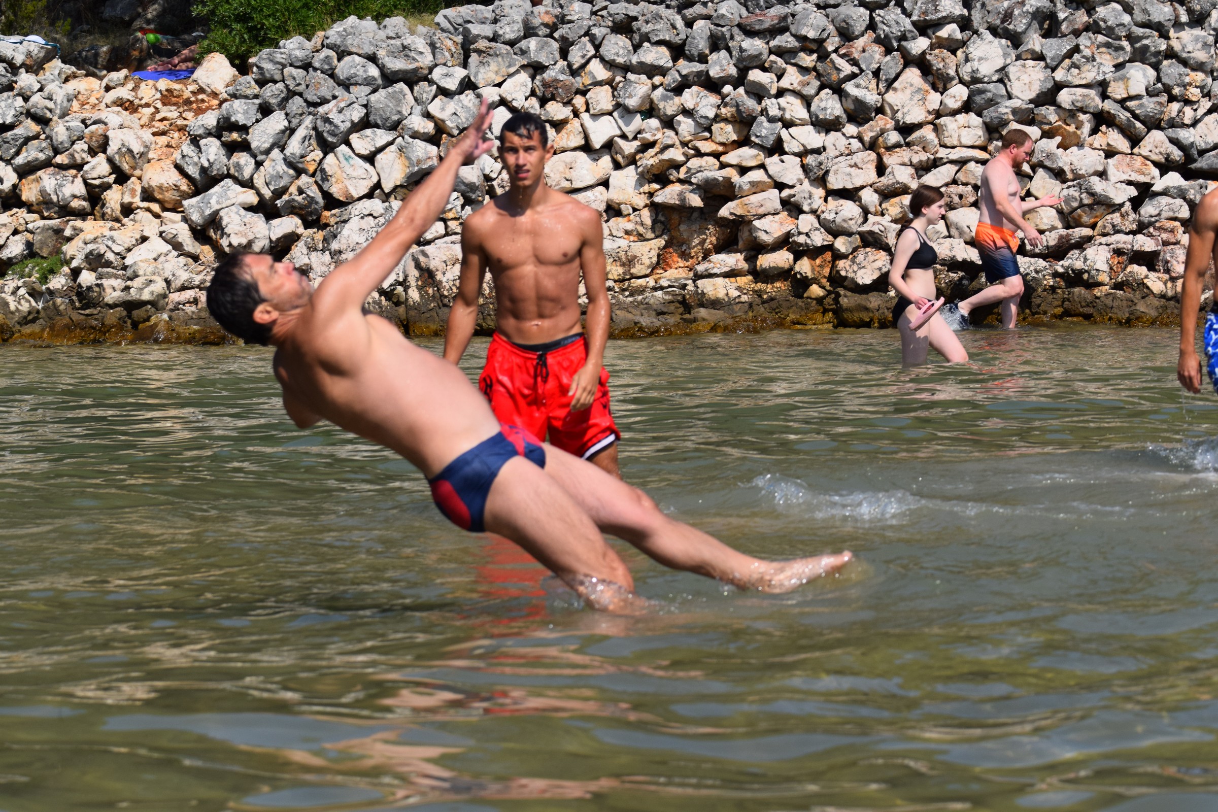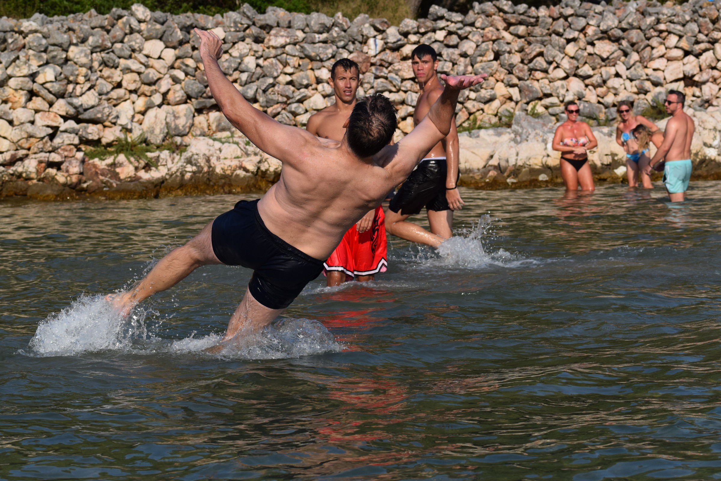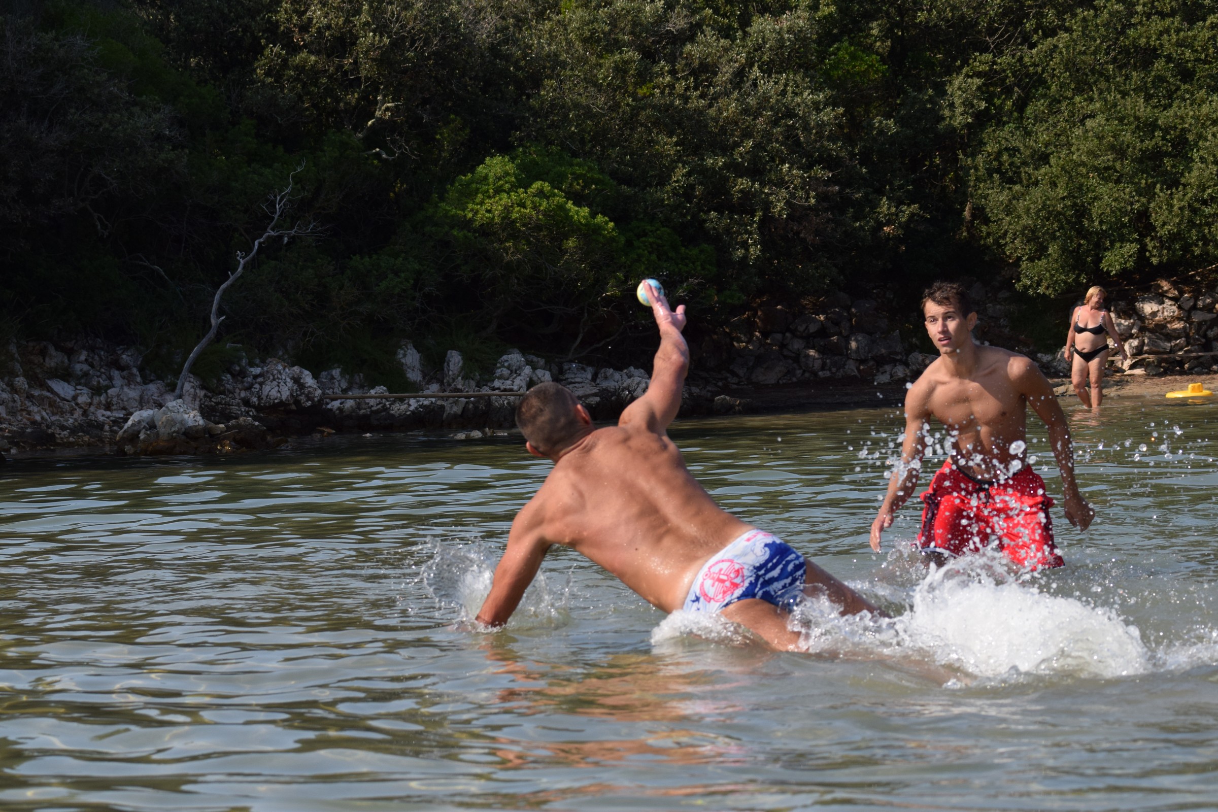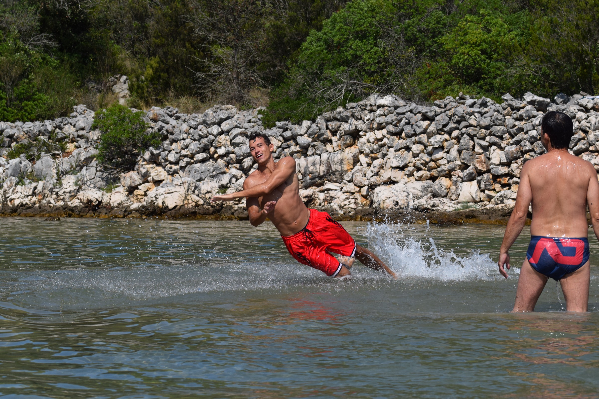 Nakon nekih uru vremena picigina, kum Jure i ja smo pošli malo otpočinuti na brod (Sergej se negdje napola runde odvojio i priključio obitelji), ja sam uzeo fotoaparat i još pet minuta poslikao četvoricu mladaca kako letaju, a kad sam se vratio na brod sam mobitelom snimio i par videa.