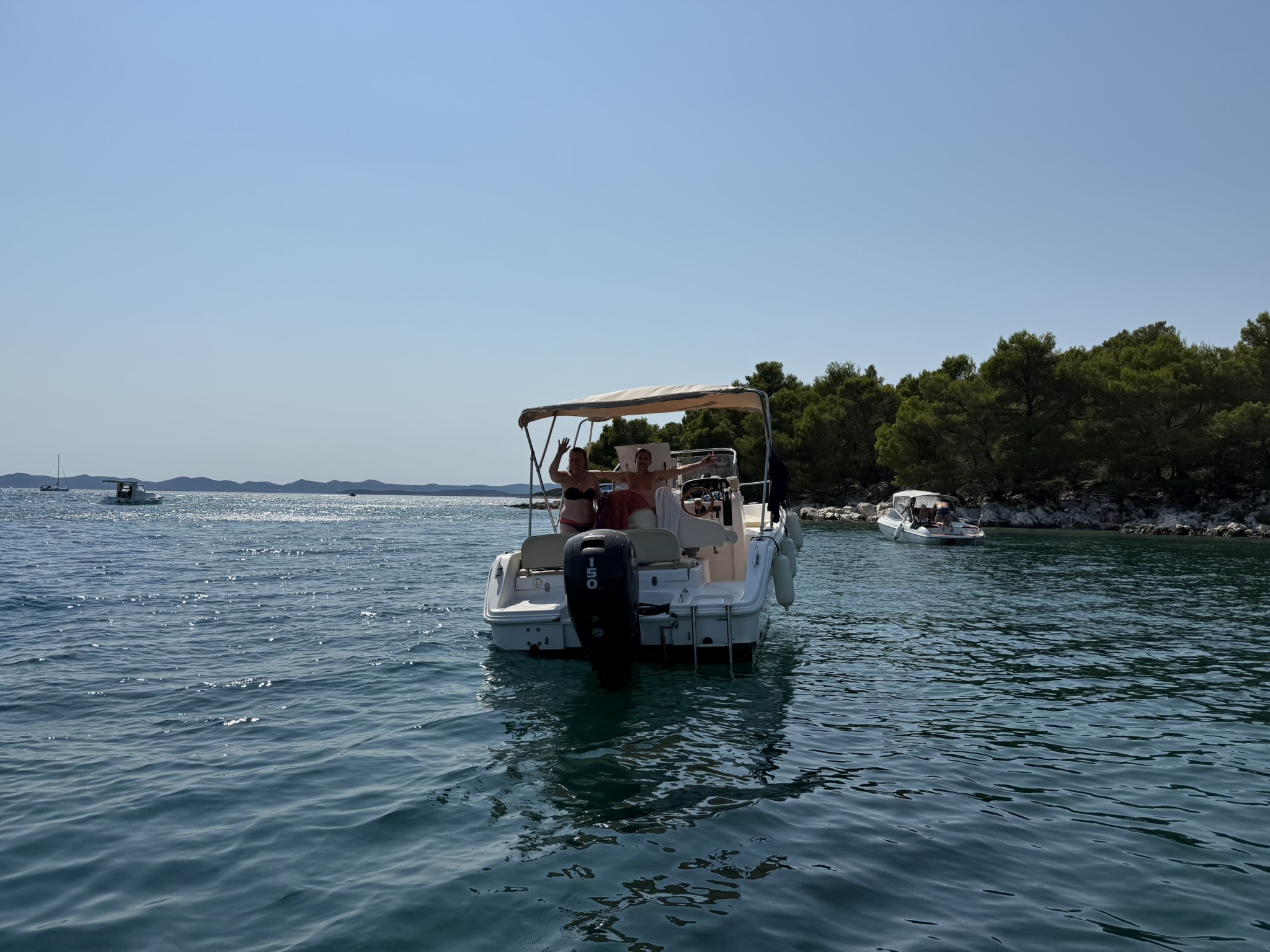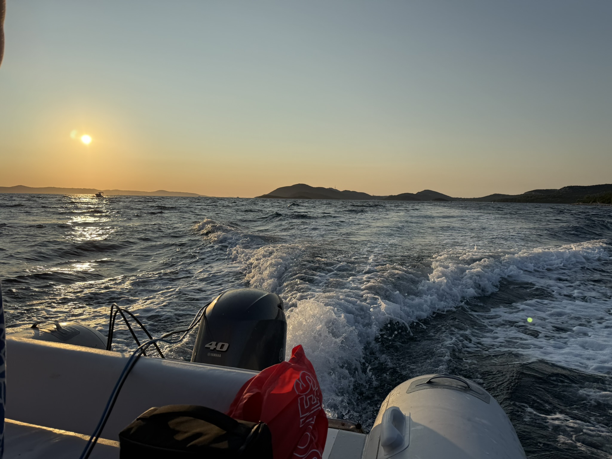 I ove godine smo se skupili već u 14:30, i također odmah krenuli oštro … s time da smo zbog nezgodne tramontane zbog koje su nas valovi lipo polivali, za točenje prvog pića ipak sačekali da dođemo do naše Gospe od Sniga.