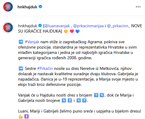 A treba se obilježiti i “službeno predstavljanje” ❤️, a kojem su uz Luanu kao nove igračice Hajduka predstavljene i sestre Prkačin, Gabrijela i Marija ❤️❤️.