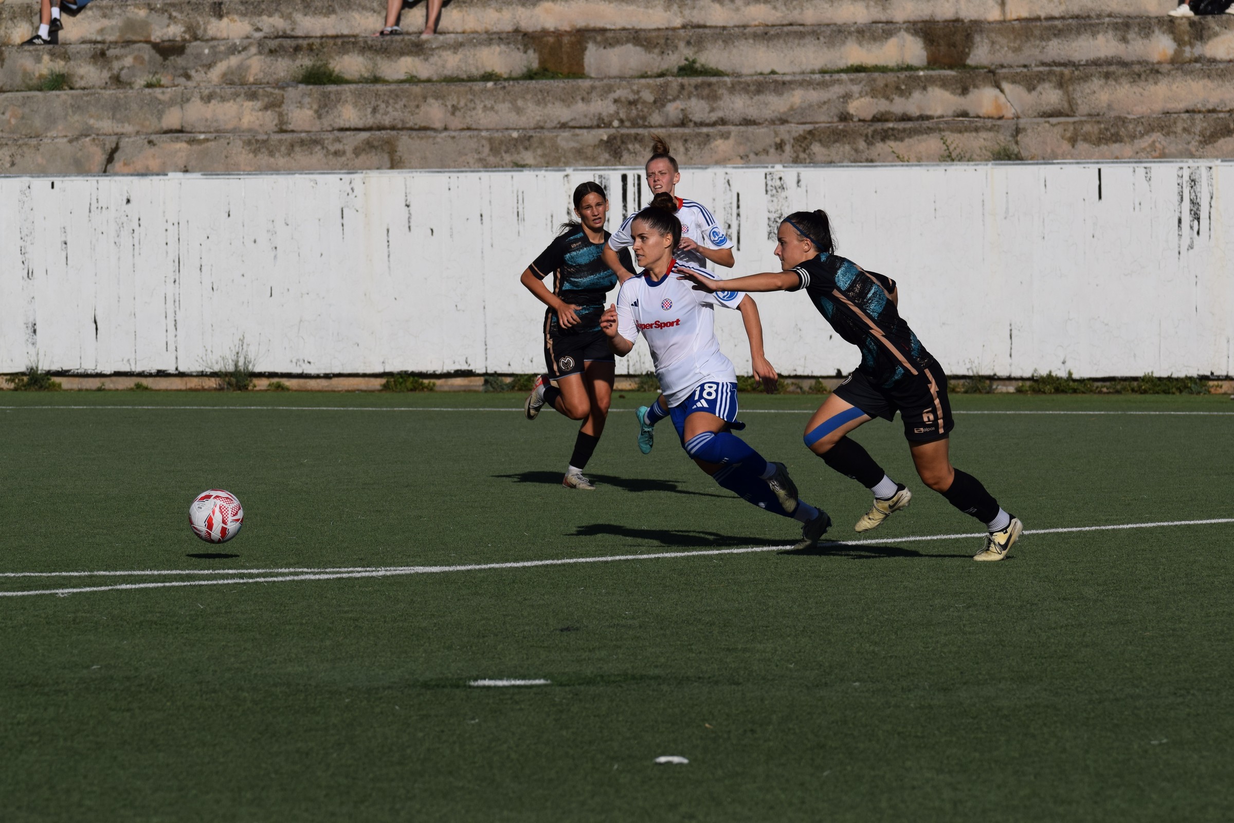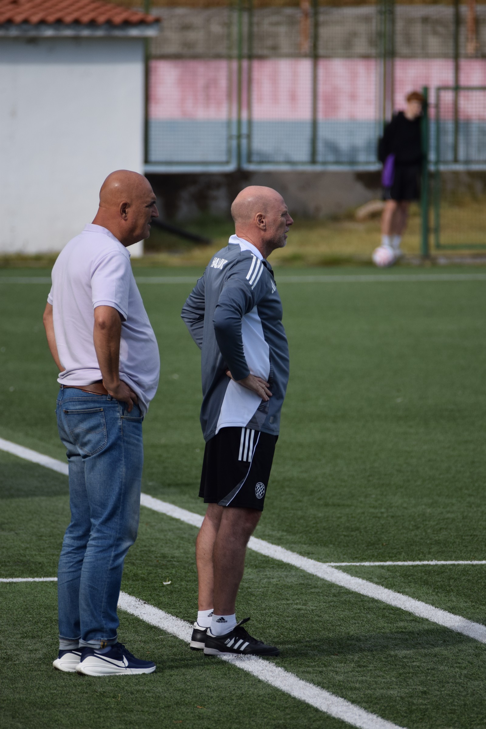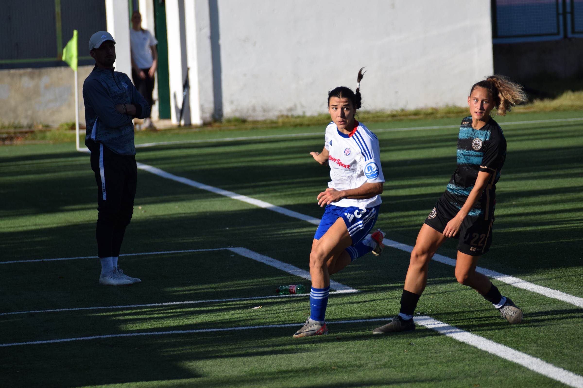 Prebacio sam se u drugu traku, malo smo požurili do Splita, i na pomoćnom igralištu Poljuda, gdje ŽNK Hajduk igra svoje domaće utakmice, sam bio u 15:50 … ja i još troje ljudi na tribinama 😂 (kasnije, kad je granulo sunce, se gledalište popunilo) … a jedan od tih troje, skroooz lijevo na početku tribina … Vanja Kovač, trener seniorske ekipe Agrama. Agramerke igraju sutra protiv Splita u Zagrebu, i to je lijepa posvećenost trenera 👍.
