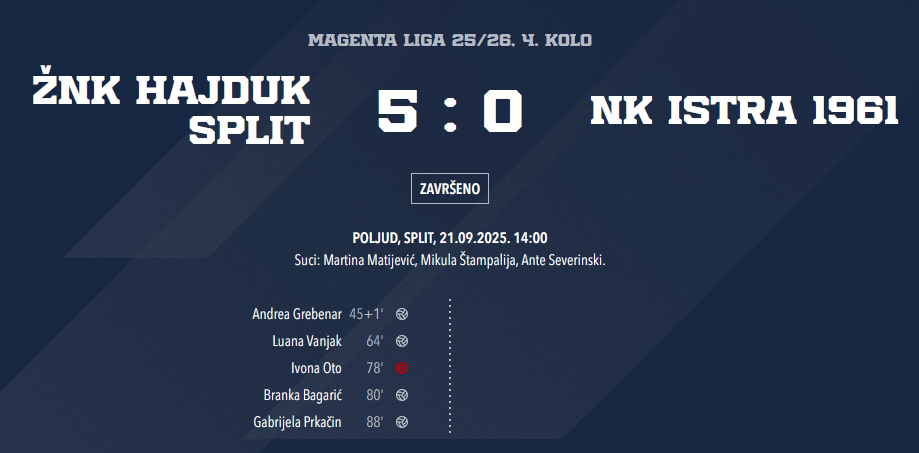 Gol za završnih 5 : 0 je postigla Gabrijela Prkačin pred sam kraj utakmice, izvrsno reagirajući u petercu na odličan nabačaj Janje Čanjevac, i nakon dva gola u dvije utakmice polako se nameće kao izvrsno zamjensko rješenje u napadu Hajduka.