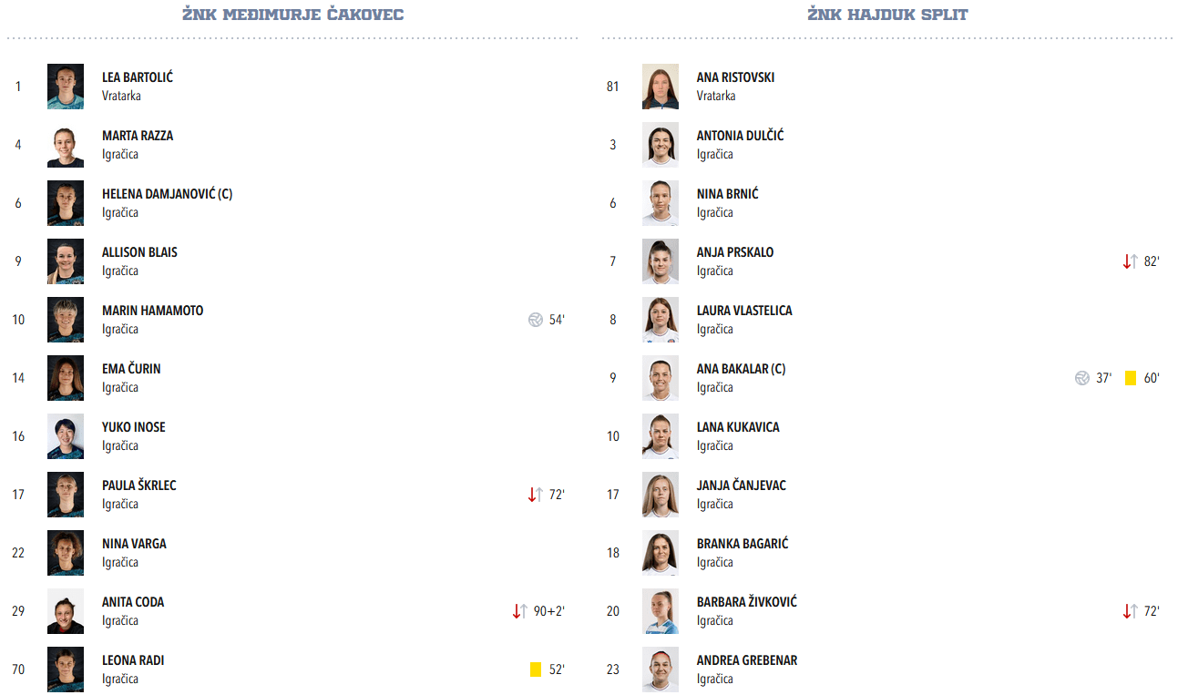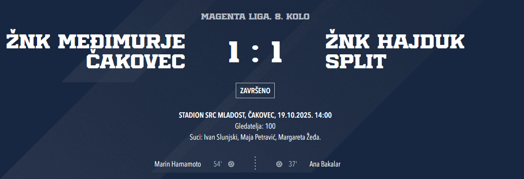 Jer, sekundu nakon te pogreške njegove igračice, Međimurke su otele loptu Hajdučicama, povukle po svojoj desnoj strani napad, odličan ubačaj u sredinu gdje je Marin Hamamoto bila sama ko duh točno na penalu (ovo sam sve vidio na snimci), i njen još odličniji udarac glavom koji je uz samu stativu ušau gol za 1 : 1.