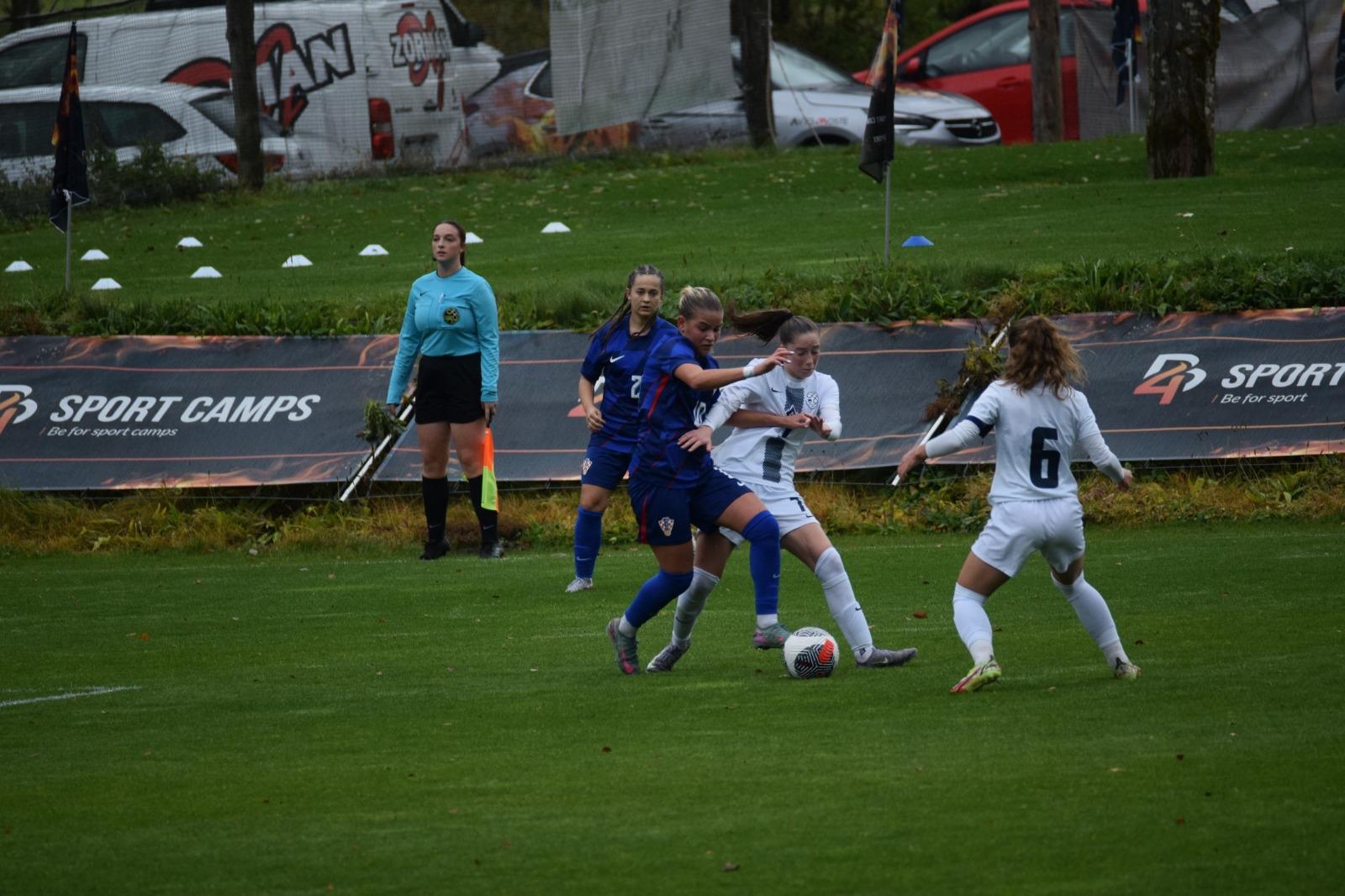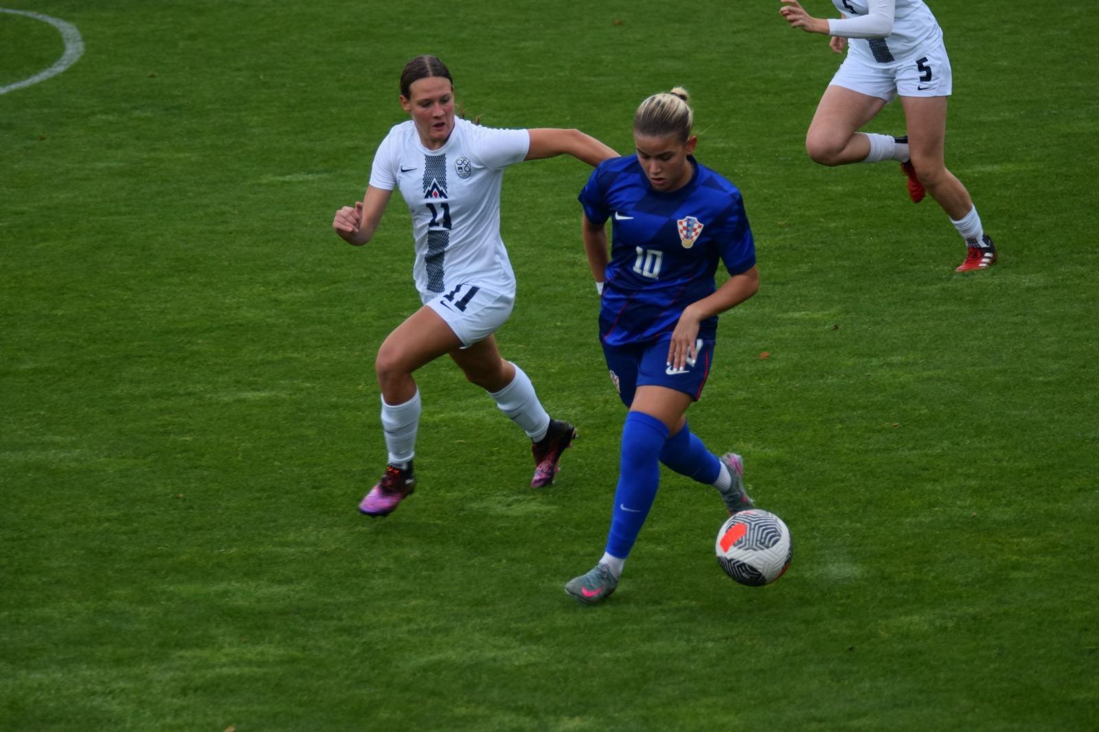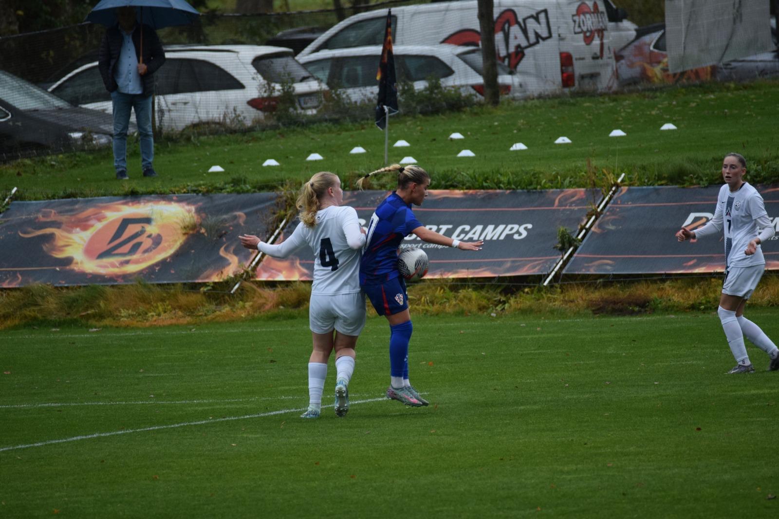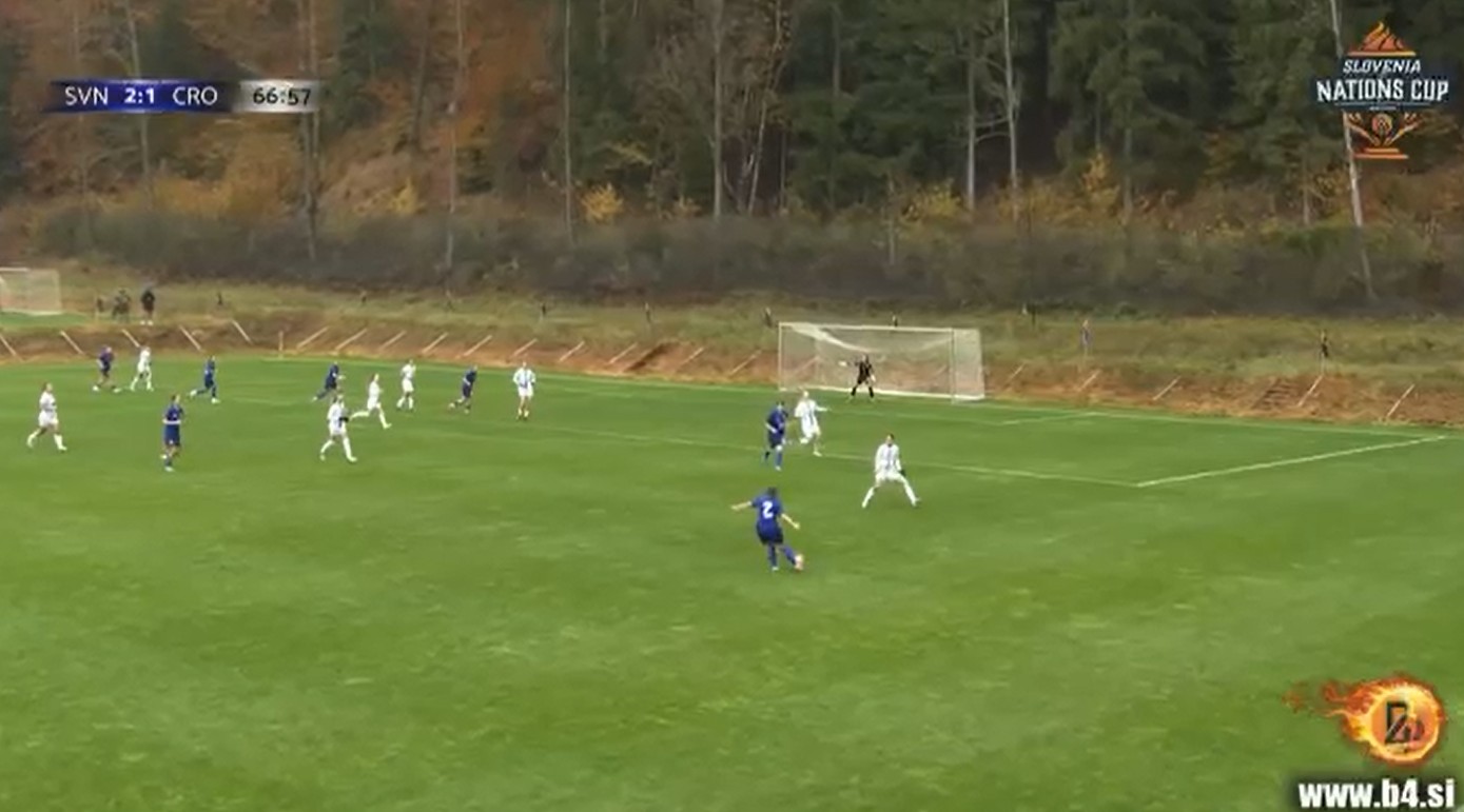 Maja Modon je povukla po lijevoj strani i ubacila odlično na lijevo krilo za njihovu napadačicu, Kloba je krenula pa stala i zbunila Akrap, a slovensko krilo upućuje neometanu loptu pred naš gol gdje njihova desetka odrađuje lagani tap-in i to je 2 : 0 za Sloveniju.