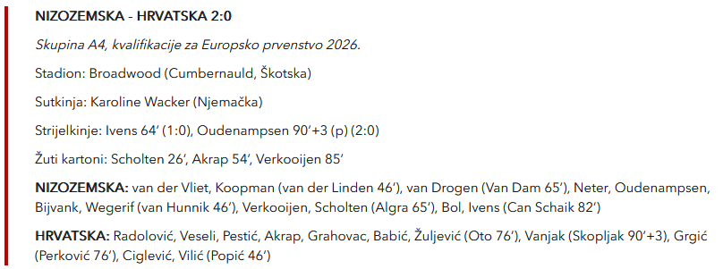 U utakmici 1. kola skupine A4 kvalifikacija za WU-19 EURO 2026, Nizozemska je pobijedila Hrvatsku, i to se odmah mora reći, posve zasluženo 👍. Nizozemke su bile bolje cijelu utakmicu, napadale praktički cijelo vrijeme i pokazale da nisu bez razloga trenutne europske WU-17 prvakinje, i svjetske viceprvakinje!
