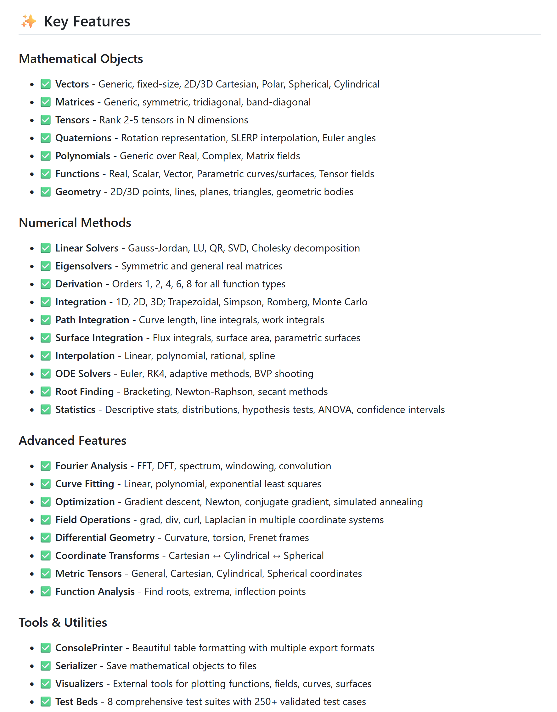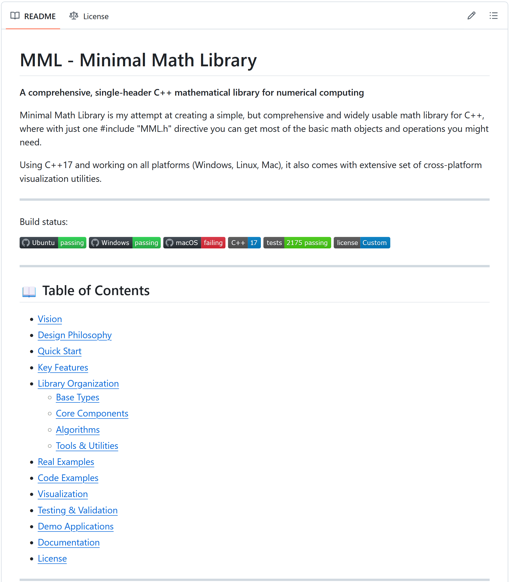 Nije još to ni blizu skroz gotovo, i imam u Todo listi puno daljnjih poboljšanja, ali ona osnovna vizija, da na početku svog C++ programa staviš #include “MML.h” i dobiješ na raspolaganje praktički sve što ti može zatrebati iz područja numeričkog izračunavanja, bez zajebancije s build sistemima i dodatnim dependencyima, i da to sve radi kako treba da se ti možeš posvetiti rješavanju svog problema … ta vizija je sad realnost.